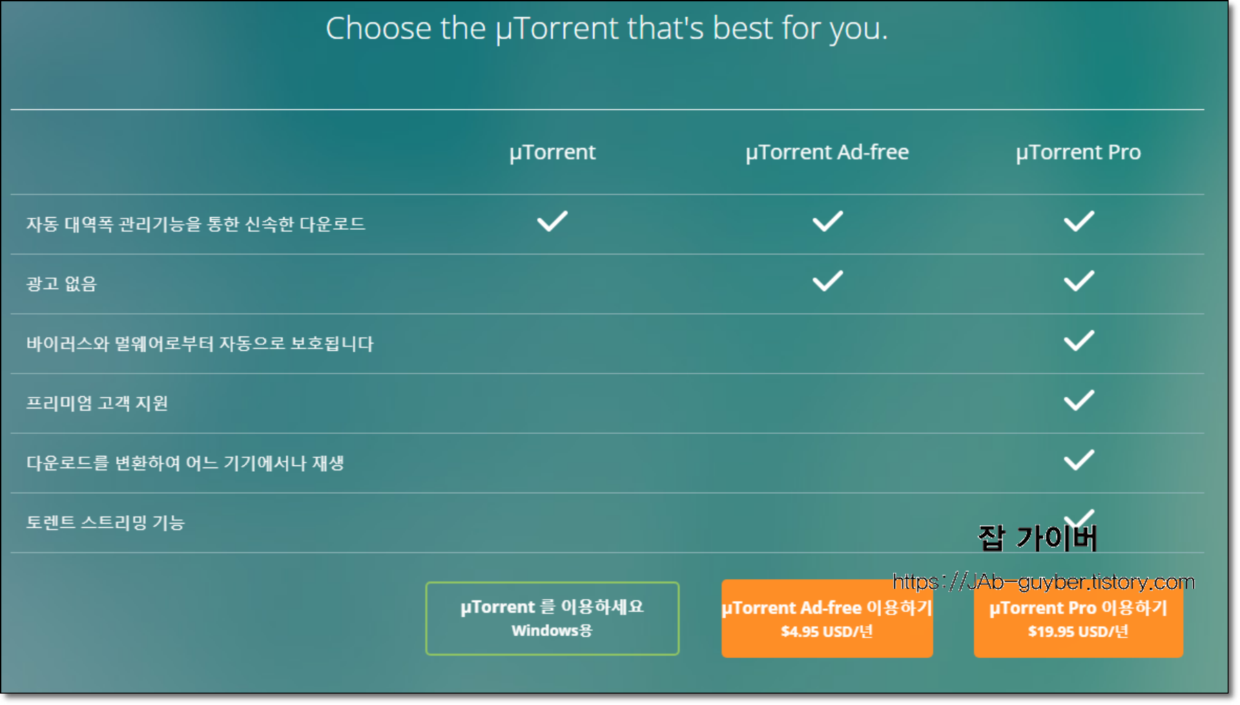 uTorrent 사이트에 접속하면 유료와 무료버전으로 다운로드 할 수 있으며 유토렌트 무료버전은 아래 파일을 다운로드 받아도 됩니다.