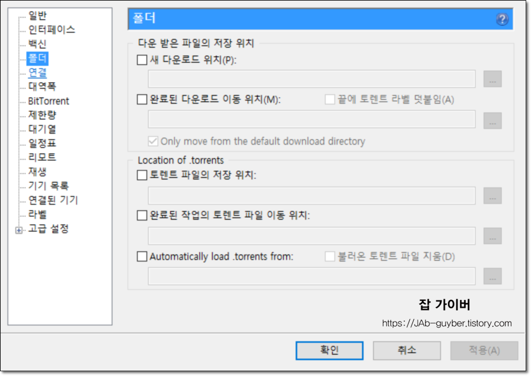 토렌트 파일을 다운로드 받을때 다운로드 위치를 기본값이 아닌 원하는 위치로 설정하기 위해서는 "폴더"탭을 이용해서 "저장되는 토렌트 파일 위치"를 지정합니다.