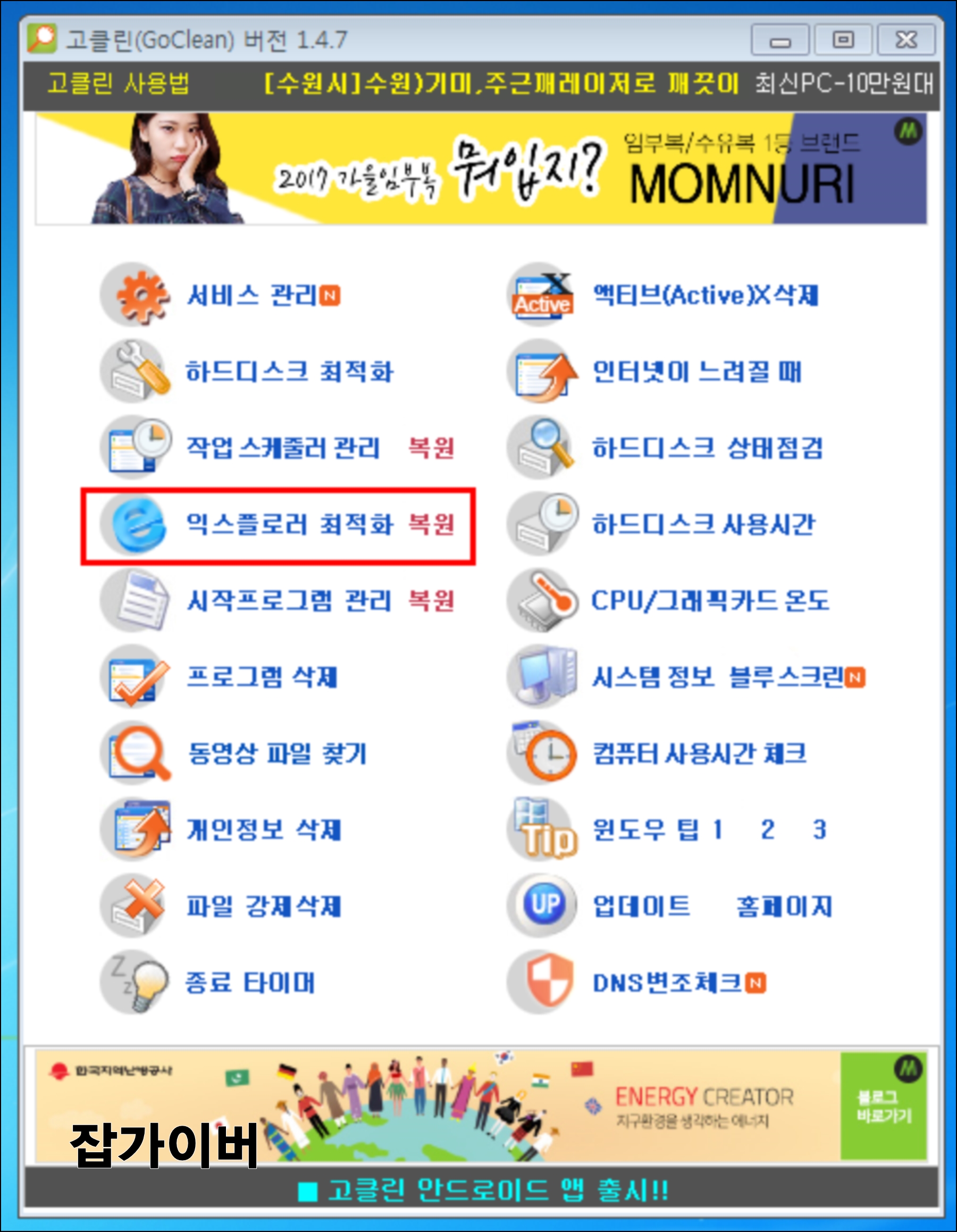 인터넷 광고창과 플러그인 및 컴퓨터에 필요 없는 요소들을 최적화해주는 장치로 고클린을 사용하는 것을 추천합니다.