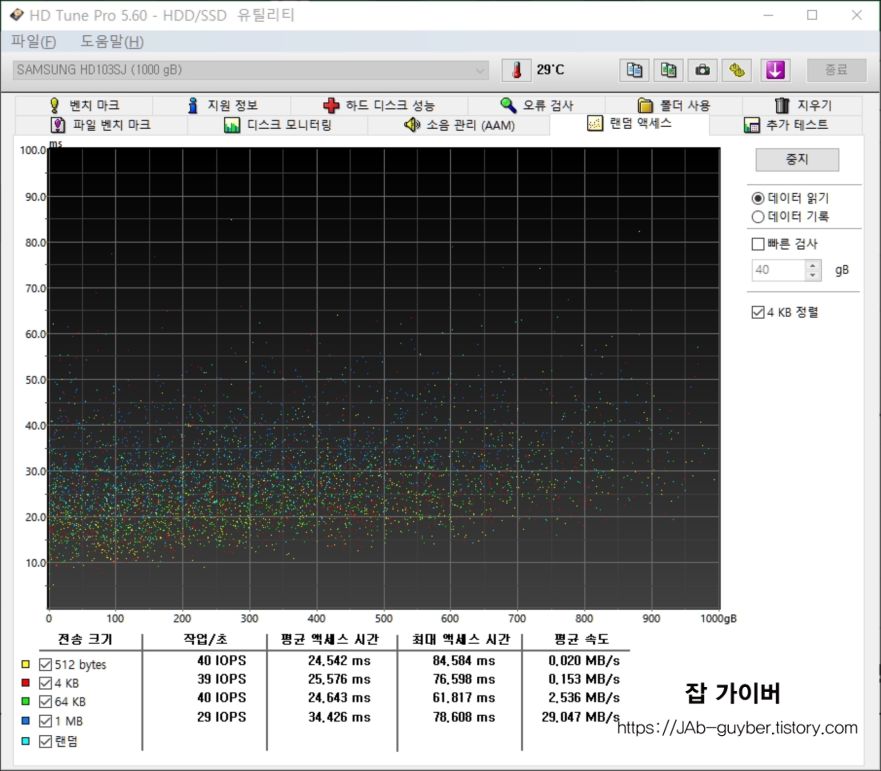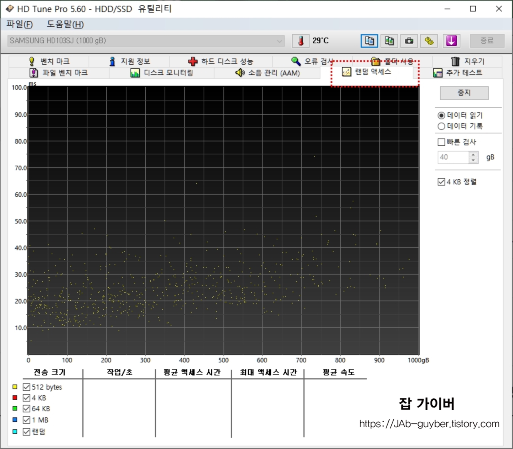 랜덤엑세스에서는 512바이트,4k,64k,1mb,랜덤값의 작업 시간과 평균 액세스 시간.최대 액세스 시간등을 알 수 잇습니다.