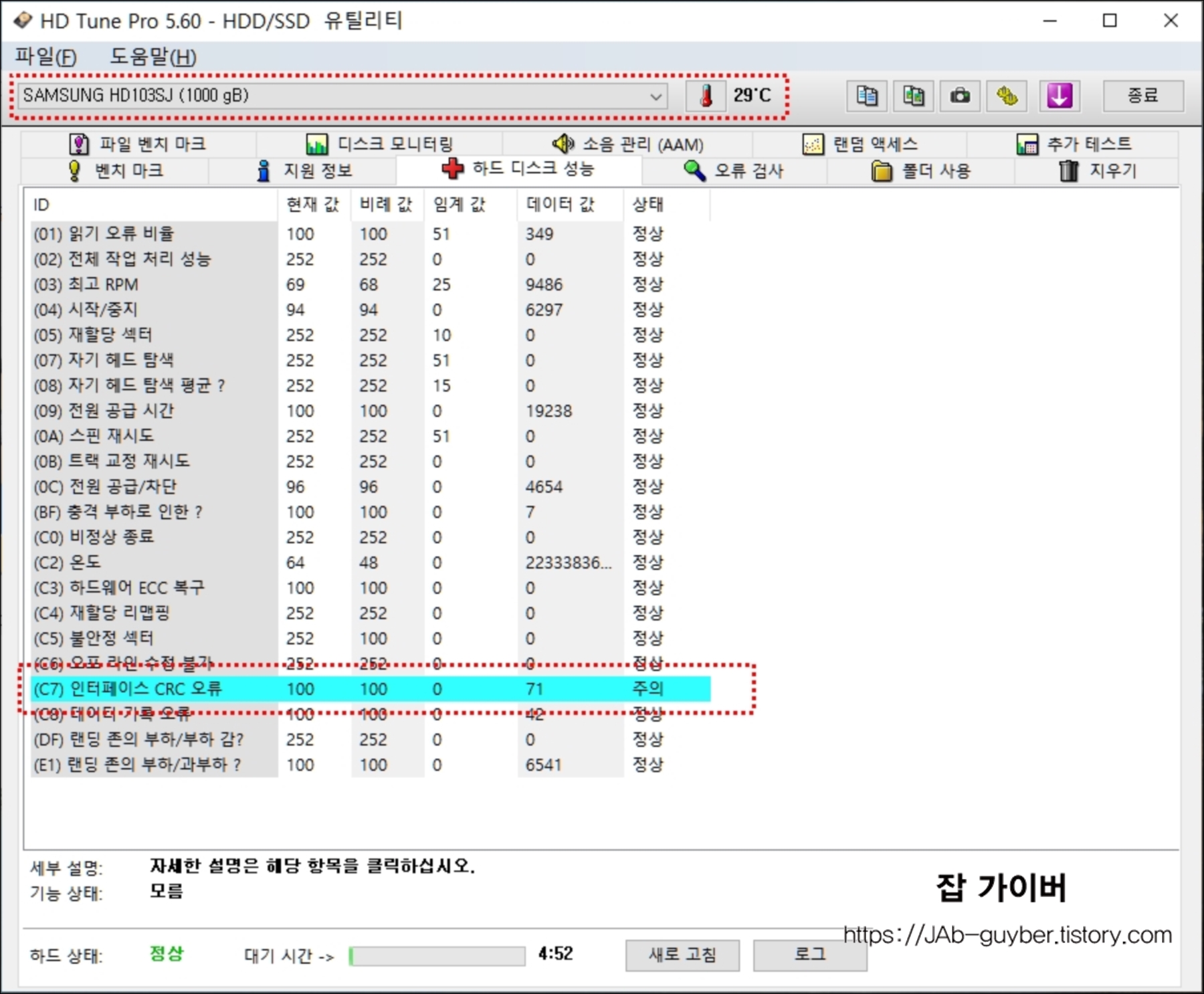 여기서 불안정한 섹터 및 오루등을 확인할 수 있는데요 제 SAMSUNG HD103SJ 모델에는 현재 인터페이스 CRC 오류가 있는것을 볼 수 있습니다.