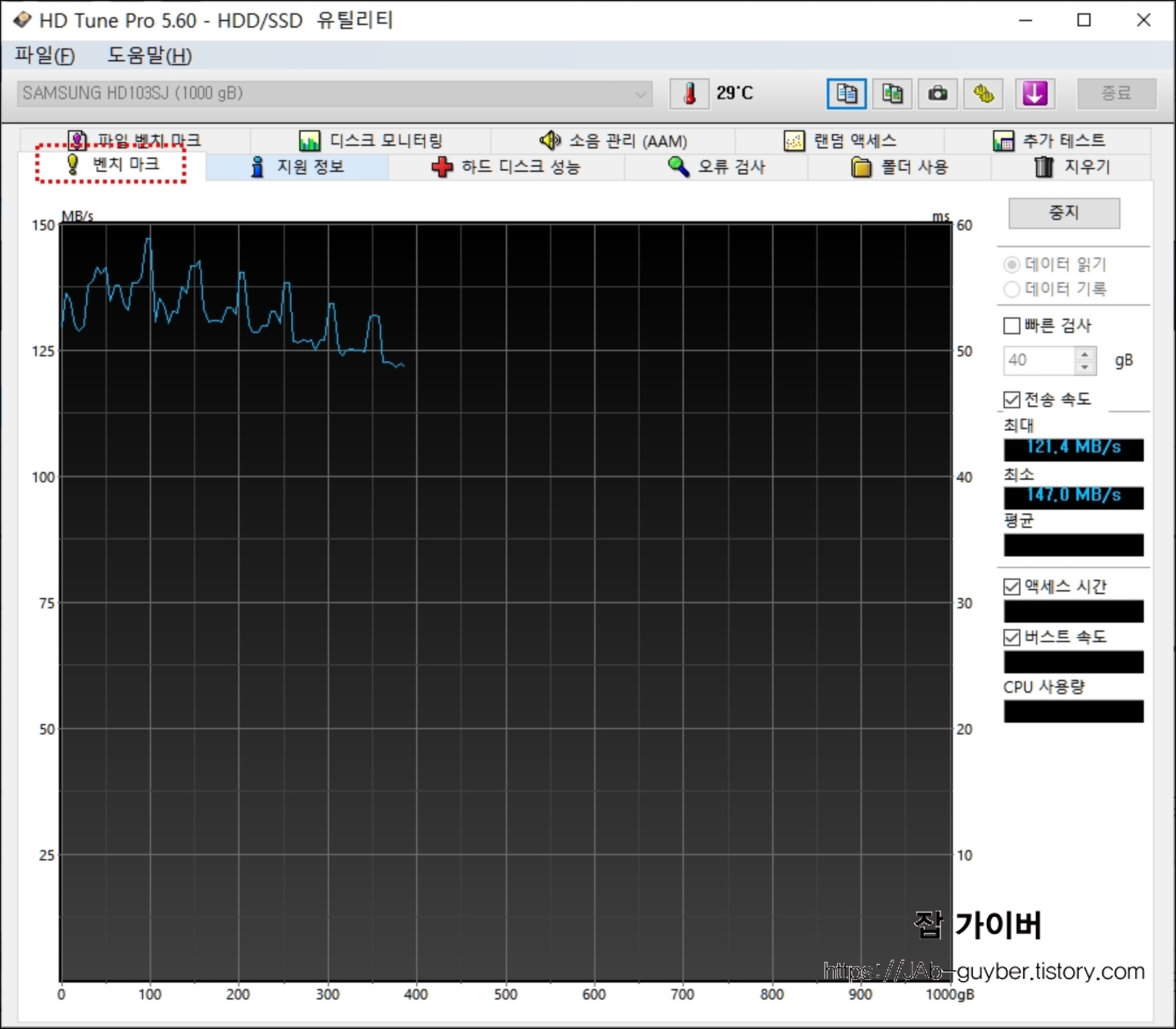 벤치마크 기능을 통해 전송속도의 최대 및 최소,평균값을 볼수 있으며 액세스 시간과 버스트 속도를 그래프로 볼 수 있습니다.