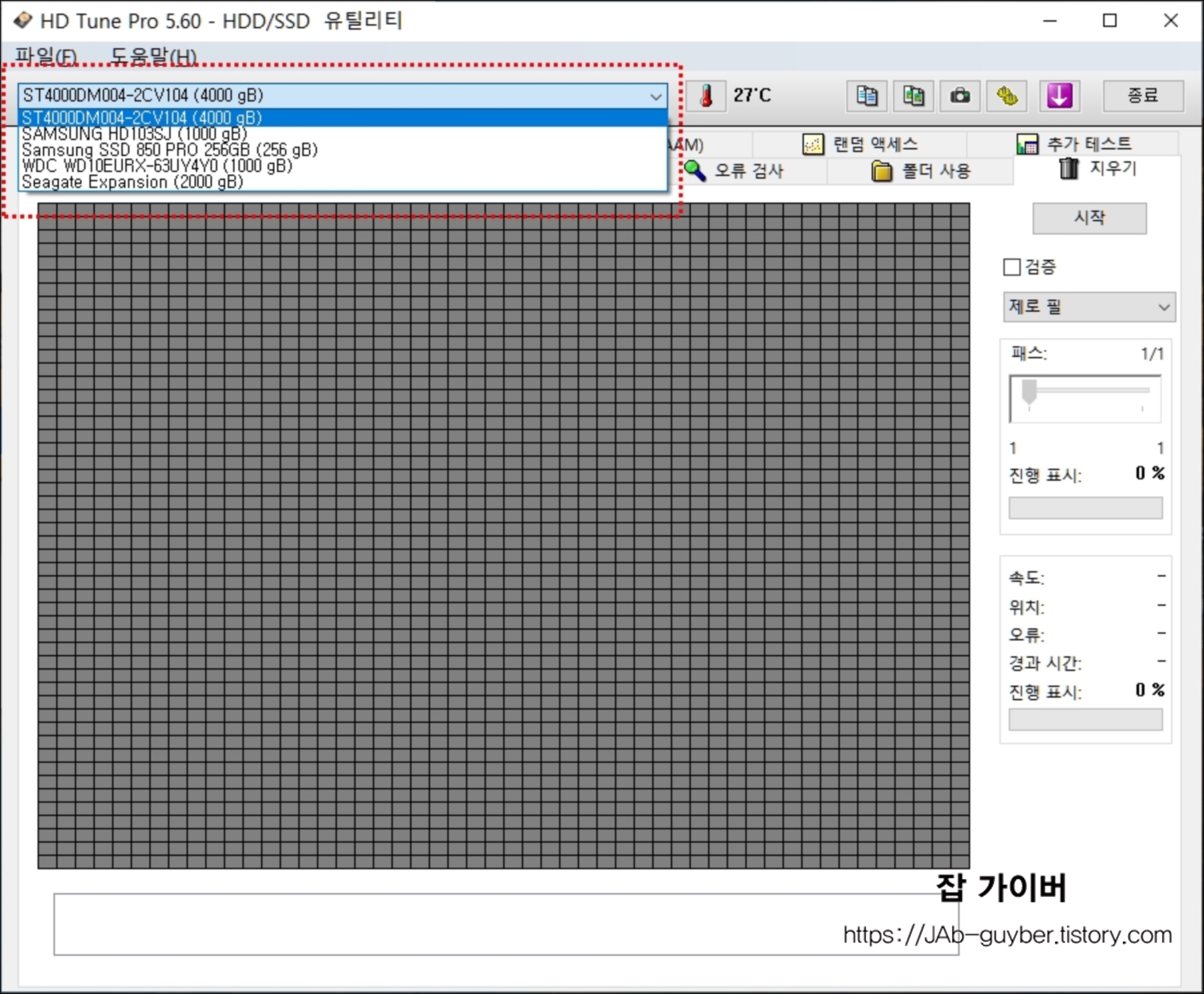 프로그램을 실행 후 좌측 상단을 보면 장착된 HDD(하드디스크) 및 SSD 와 외장하드등을 확인할 수 있습니다.