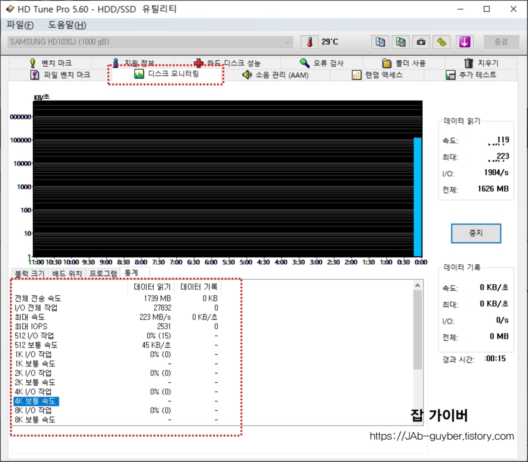 디스크 모니터링을 통해서는 데이터를 기록하는 작업속도의 최대와 보통 IOPS값을 볼 수 있습니다.