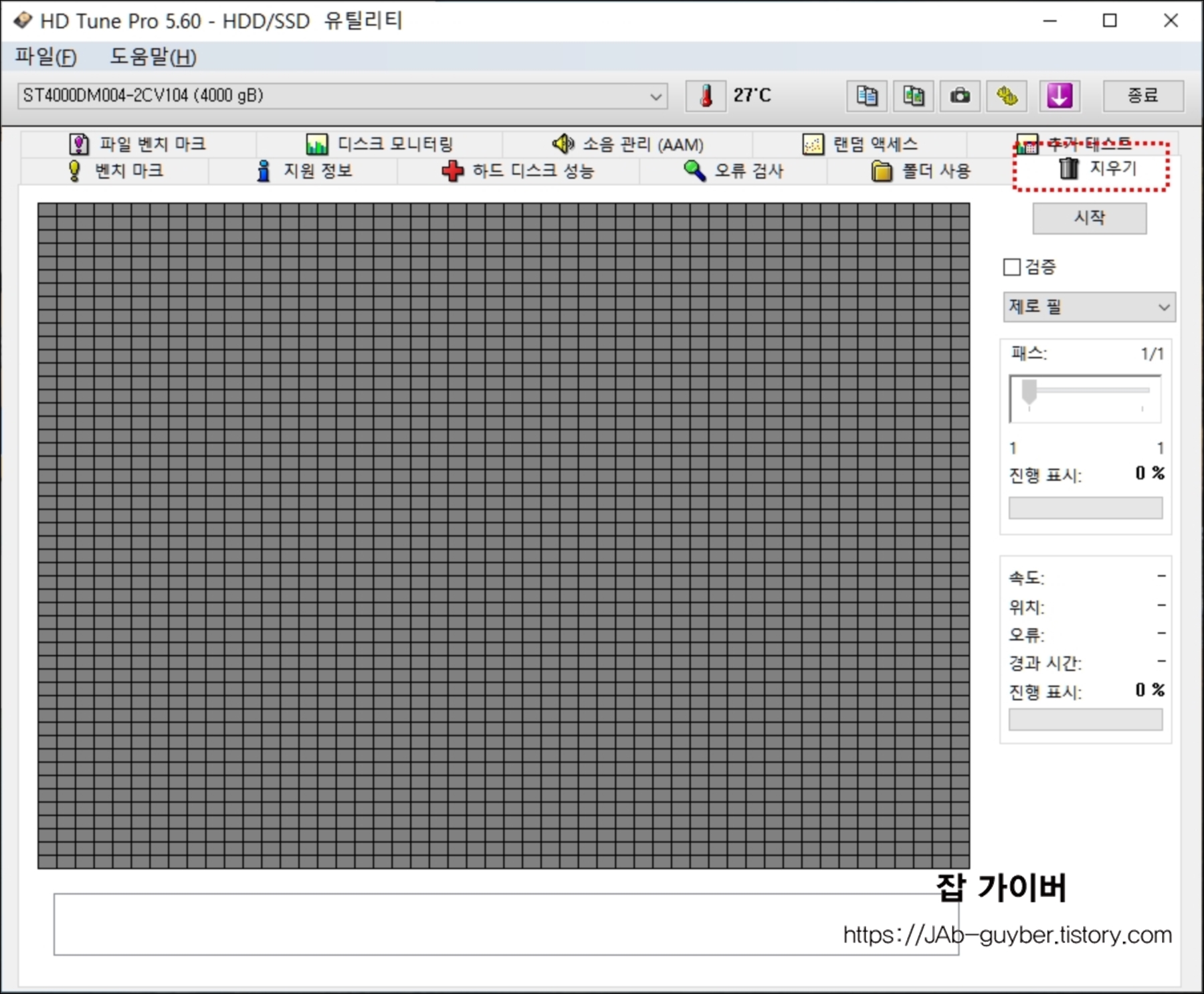 이 프로그램은 디스크의 여러 면을 분석해 주는 다양한 탭과 기능을 제공하며, "지우기" 버튼을 통해서도 간편하게 디스크 포맷이 가능합니다.