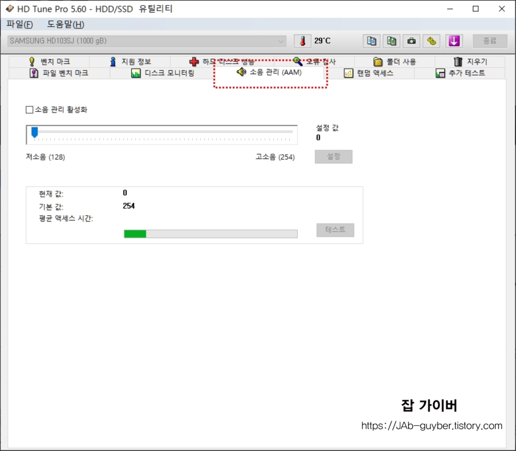 SSD와 달리 일반 HDD의 경우는 회전하면서 소음이 발생하게 되는데 소음관리 AAM을 통해 발생하는 소음을 테스트할 수 있습니다.