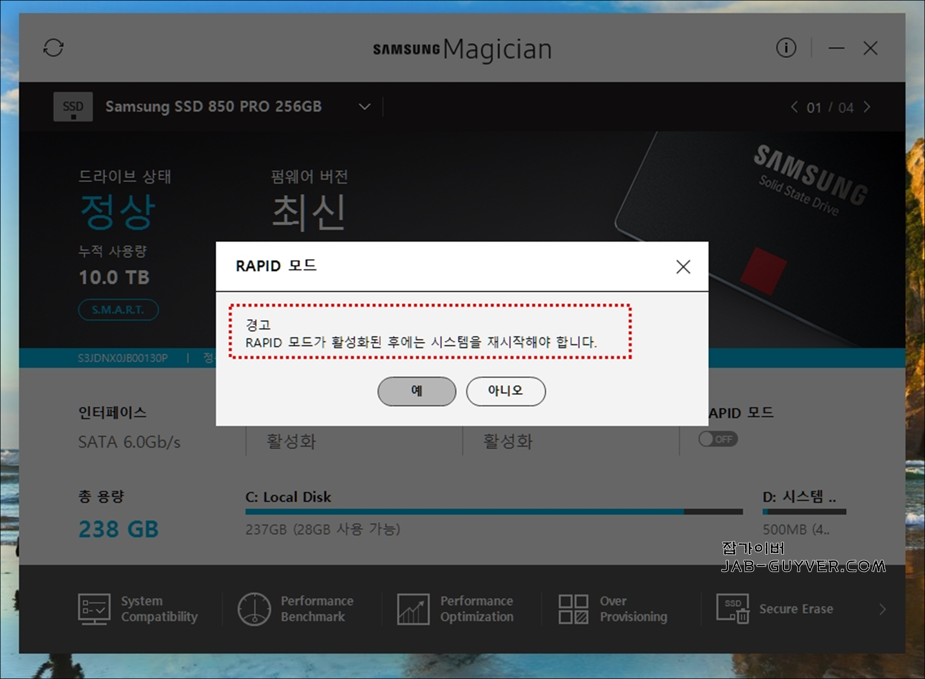 라피드 모드를 사용하기 위해서는 컴퓨터를 재부팅해야 하며 저는 특별히 지금 성능에 만족하기 때문에 굳이 사용하진 않았습니다.