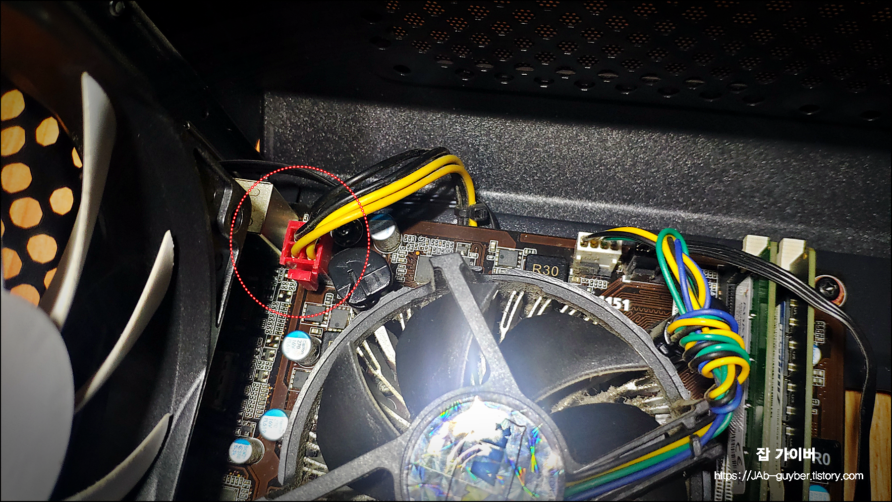 가장 눈에 띄는 것은 메인보드에 꽂혀 있는 24핀 커넥터입니다. 이 부분이 메인 전원 라인이라고 보면 되고, 커넥터 옆에 있는 고정 클립을 눌러서 천천히 위로 들어 올리면 빠집니다.
