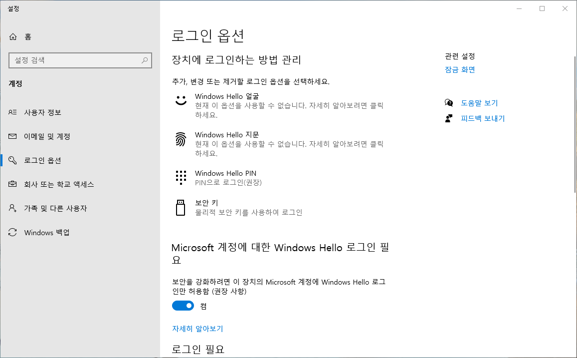 설정 > 로그인 옵션에서 기존 암호나 PIN 방식으로 전환할 수 있습니다.