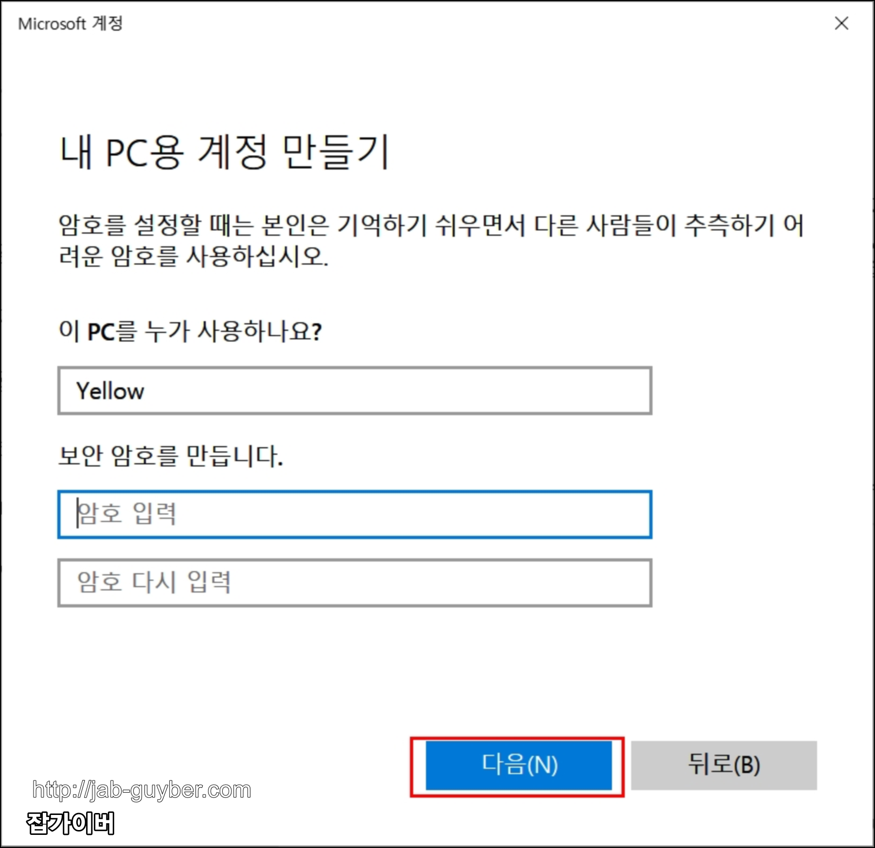 - 암호없이 사용하고 싶다면 그냥 빈공간으로 두고 "다음"