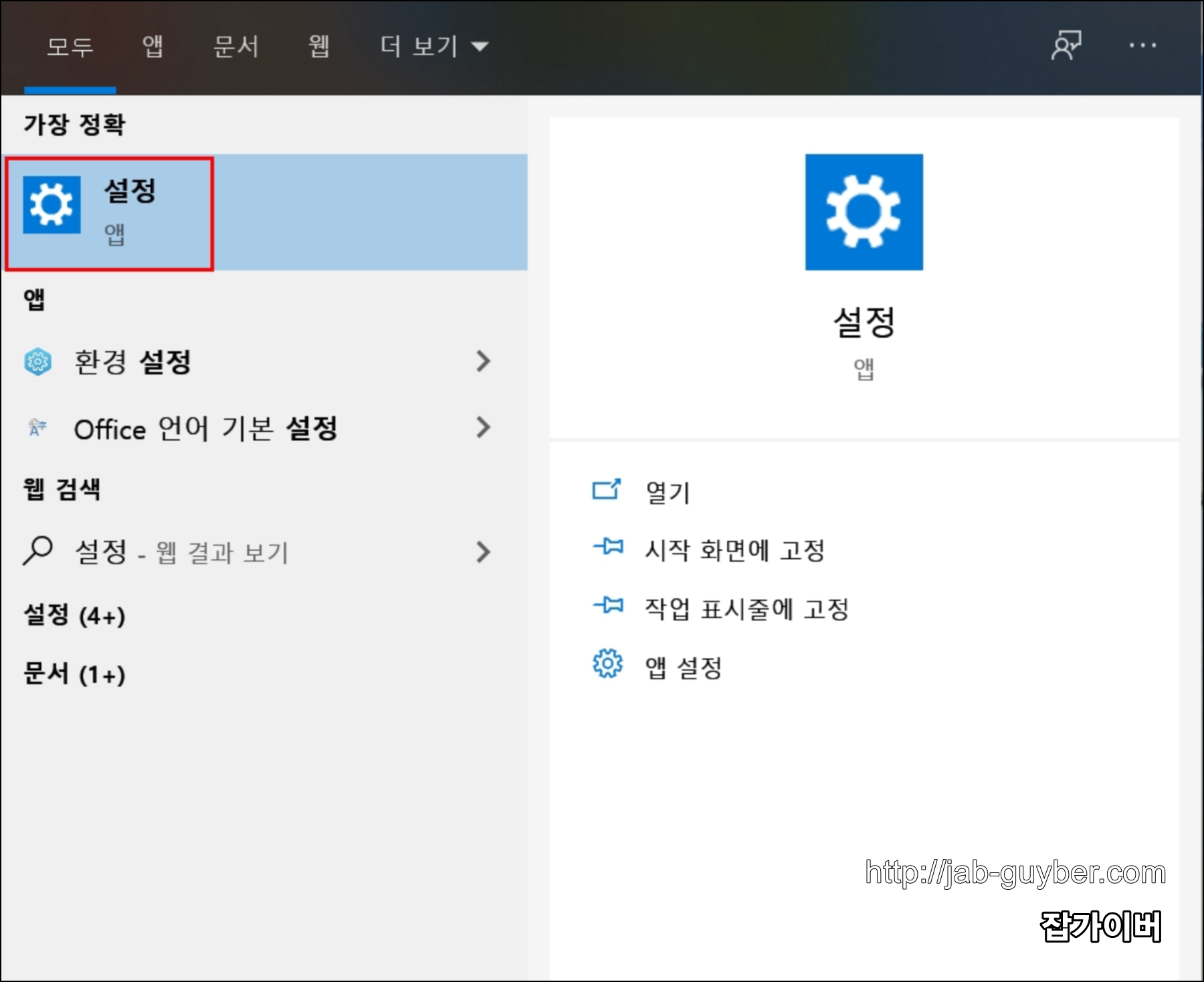 Win 로고를 클릭 "설정"입력 후 클릭합니다.