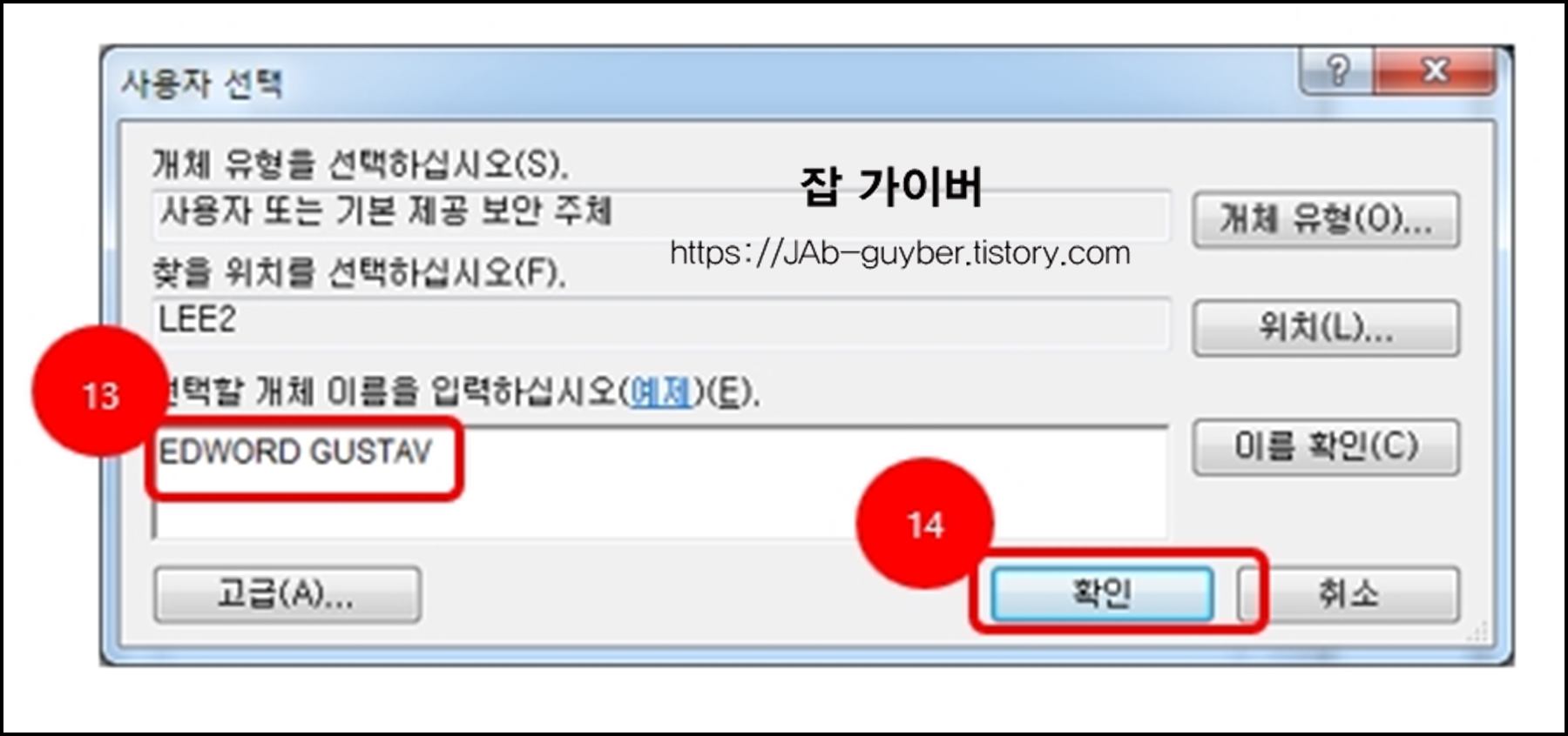 여기서 선택된 컴퓨터 윈도우의 사용자 개체 이름을 입력합니다.