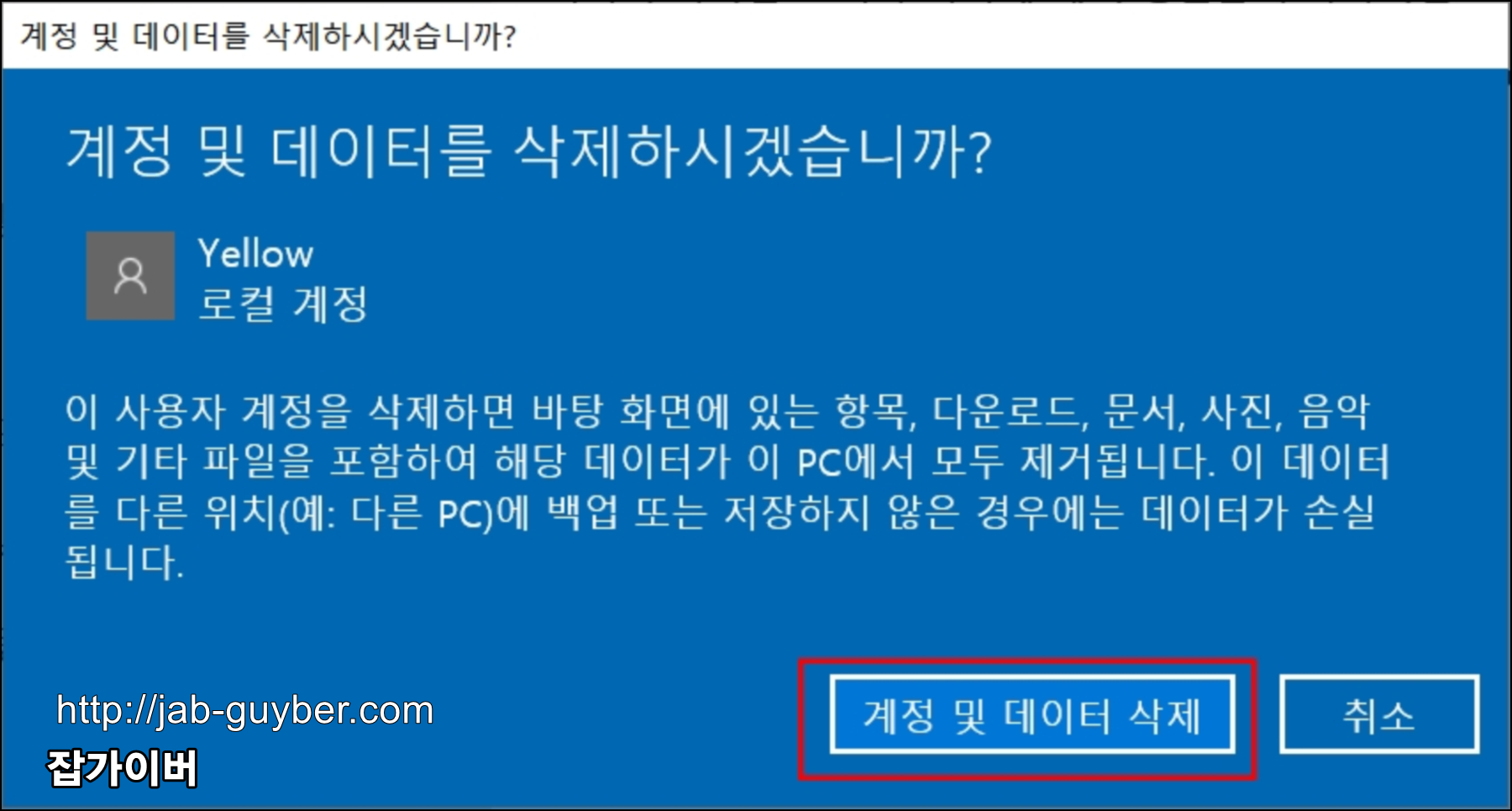 계정 및 데이터를 삭제를 하게되면 바탕화면에 있는 항목이나 다운로드,문서,사진,음악,기타파일등이 모두 삭제됩니다.