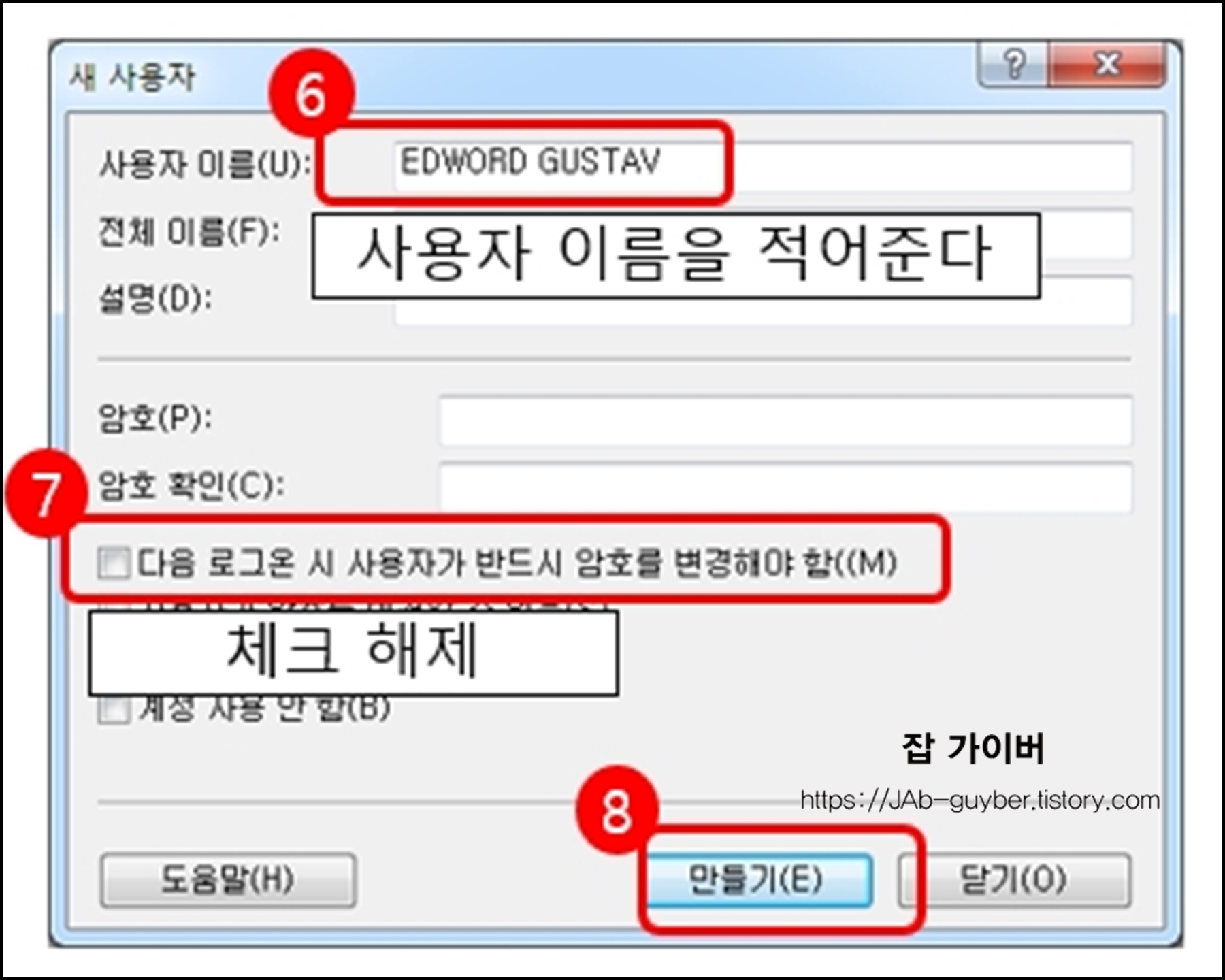 사용자 이름을 적어주고 암호를 변경해야함을 체크 해제해주세요