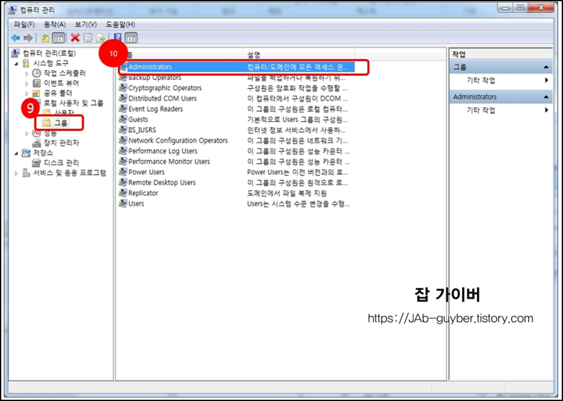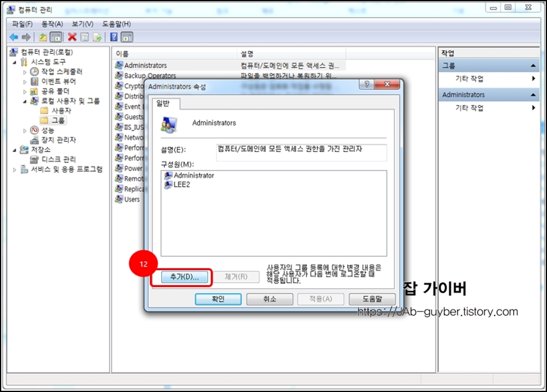 - 관리자계정 추가 및 삭제 : 시스템도구 -> 그룹 -> Administrator 더블클릭
