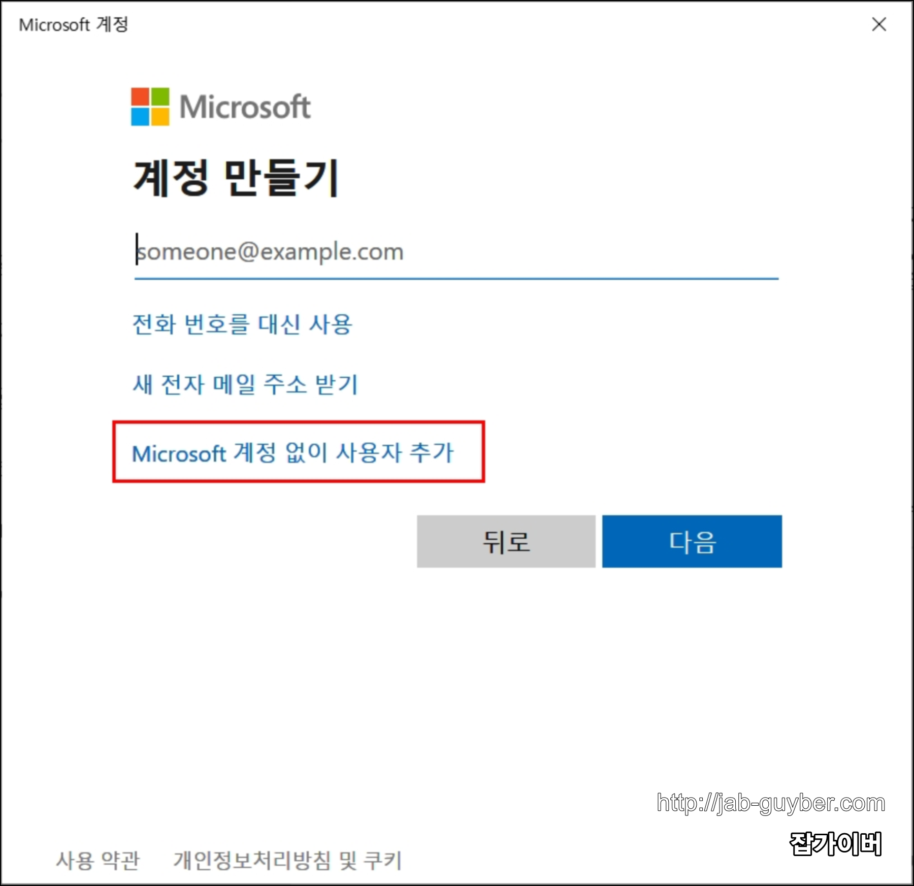 - 저는 "마이크로소프트 계정 없이 사용자 추가"를 통해 로컬 PC로 추가합니다.