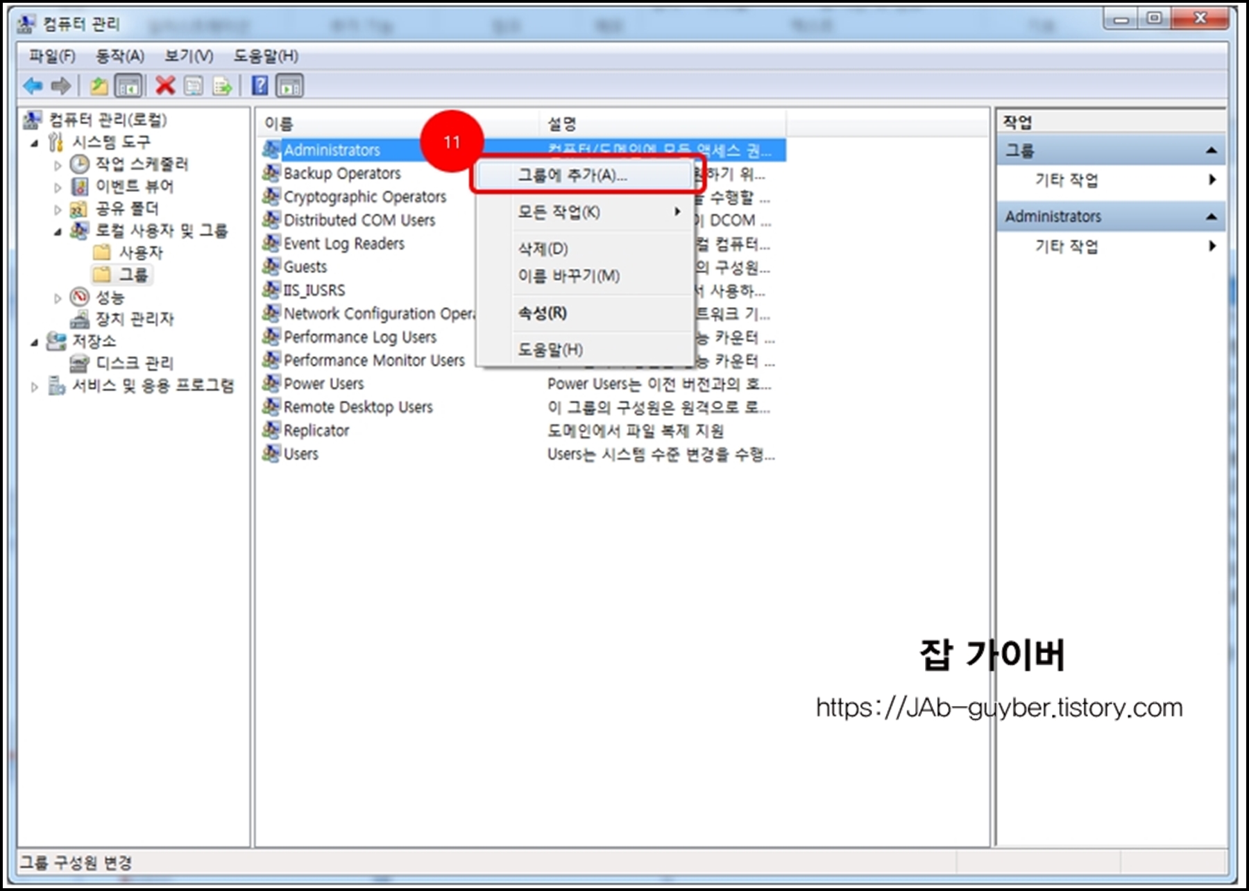 관리자 계정을 선택 마우스 우클릭 -> 그룹추가 -> 추가를 선택합니다.