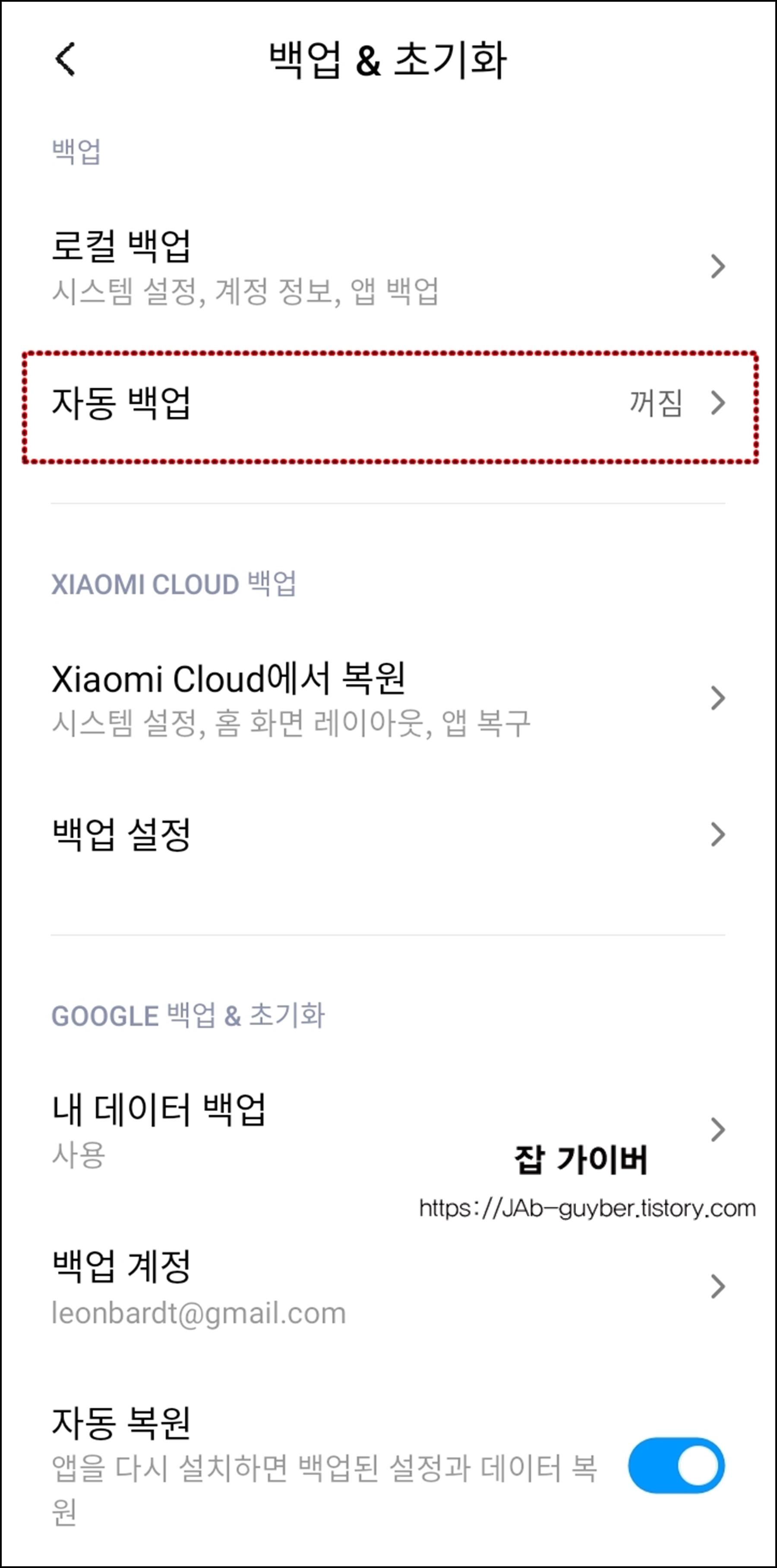 초기화는 모든 데이터를 지우는 작업이기 때문에, 진행 전에 백업은 필수입니다. 샤오미 MIUI에서는 비교적 간편하게 백업을 할 수 있는데요.