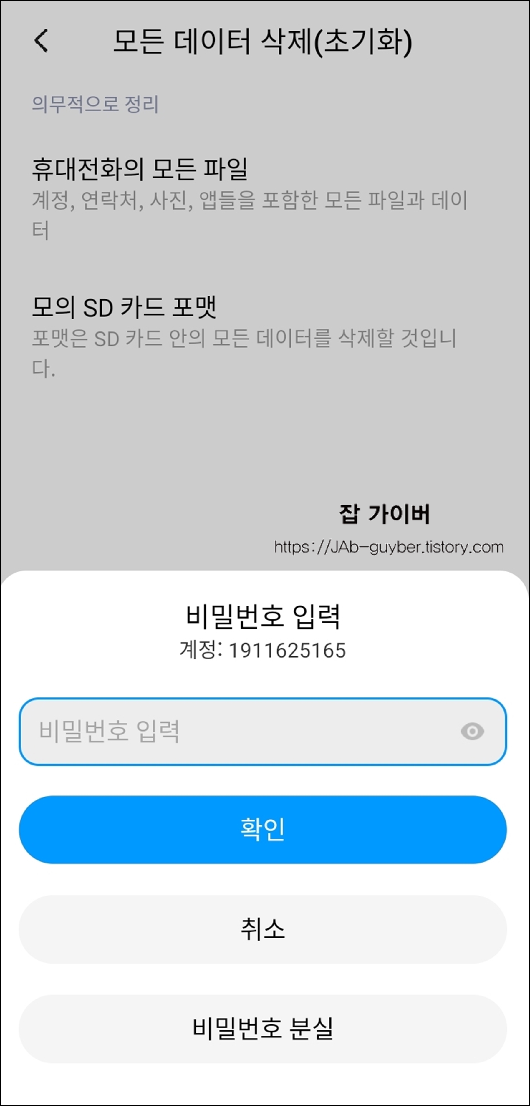이 경우 "안전 모드"로 부팅하여 초기화를 시도하거나, 전원 버튼 + 볼륨 업을 눌러 리커버리 모드 진입 > Wipe data 메뉴를 선택해야 합니다. 이때도 계정 인증은 필수입니다.