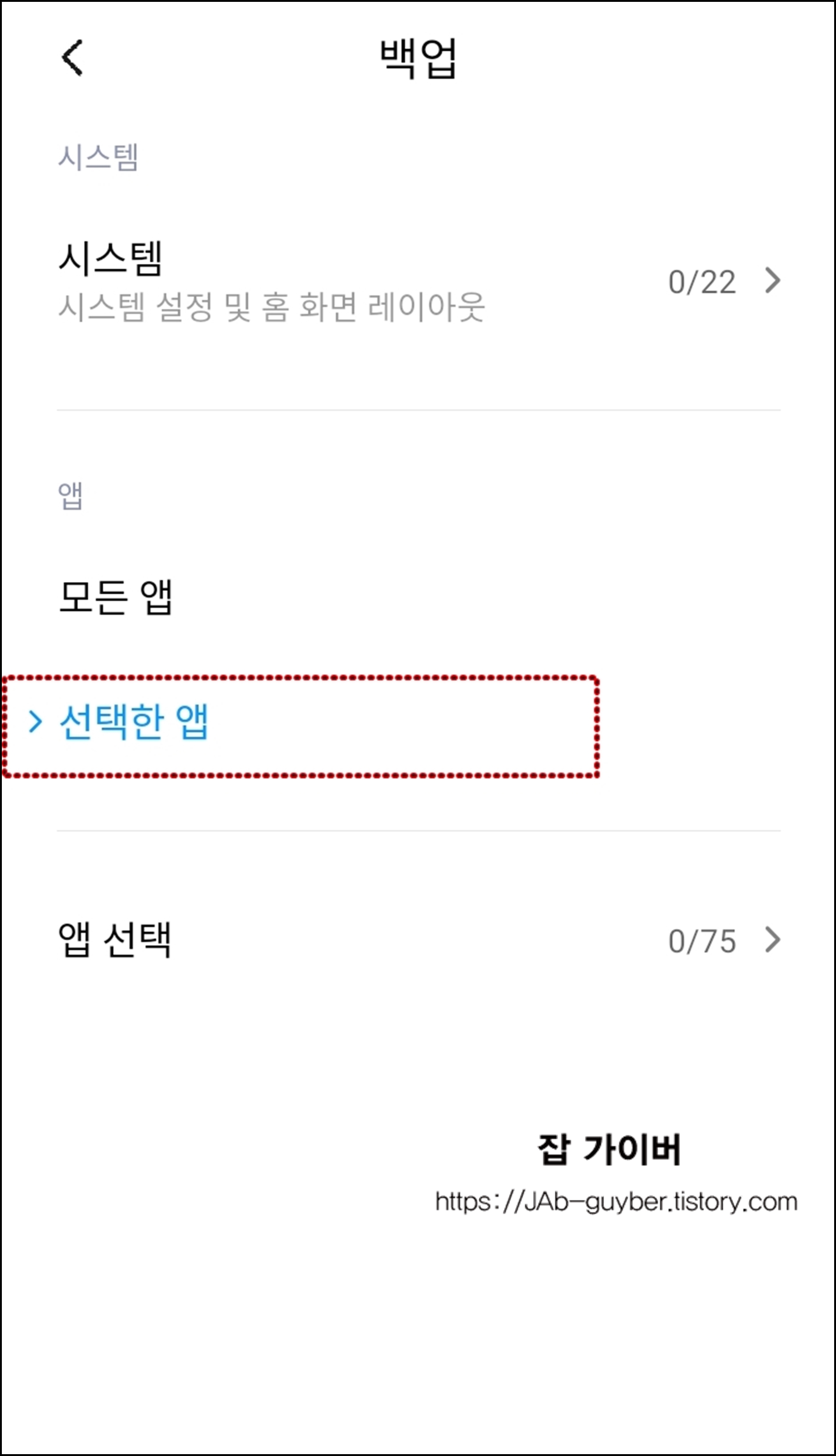 백업 및 초기화 메뉴에서는 전화번호나 메시지 앱과 같은 특정 앱을 선택하여 백업 용량을 줄이고 최적화할 수 있으며 이렇게 선택한 앱만을 백업하여 필요한 데이터만 보존할 수 있어 스토리지 공간을 효율적으로 관리할 수 있습니다.