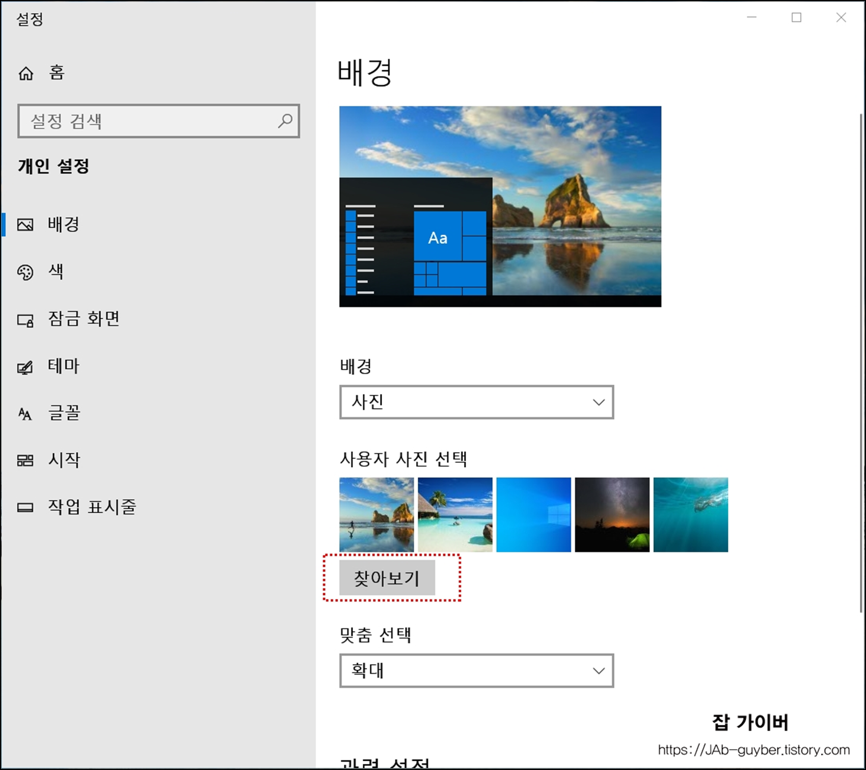 찾아보기를 클릭해 원하는 배경화면을 선택합니다.