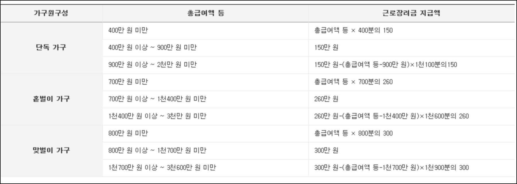 가구원 구성에 따른 총 급여액 등 근로장려금 지급금액