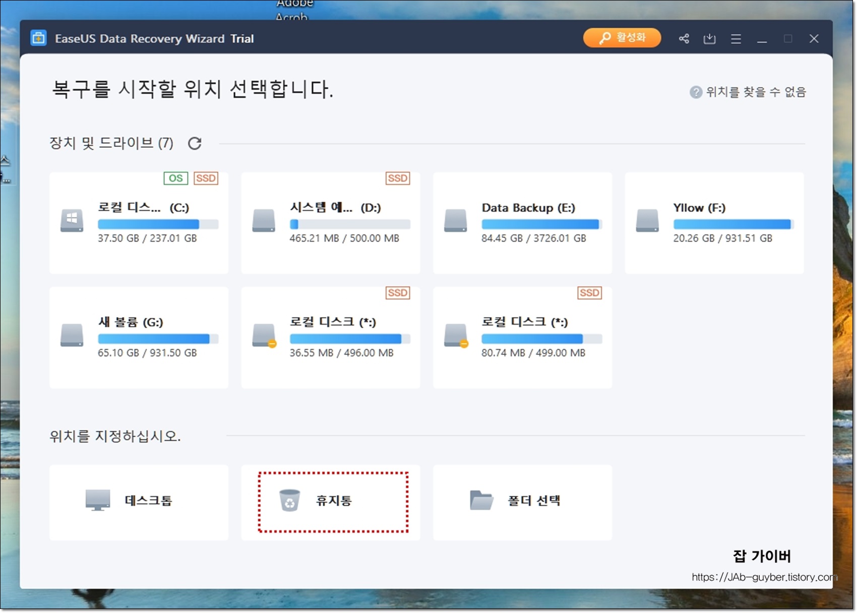 프로그램을 실행하면 PC에 연결된 각각의 하드디스크, SSD, 외장하드, USB가 한눈에 보입니다. 윈도우 휴지통에서 이미 비워 버린 파일을 찾아야 한다면 목록에서 휴지통 항목을 선택해 스캔을 시작하면 됩니다.