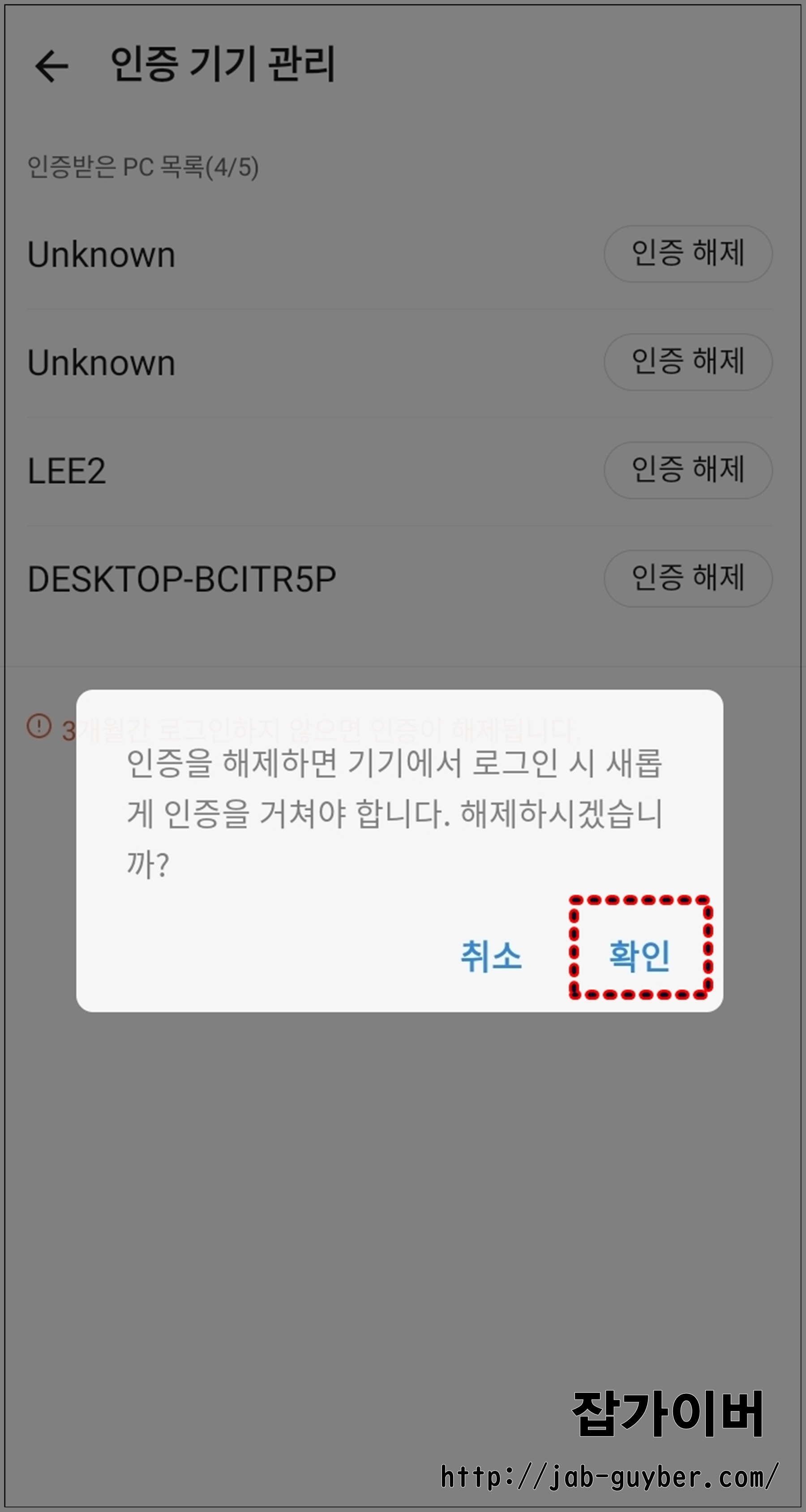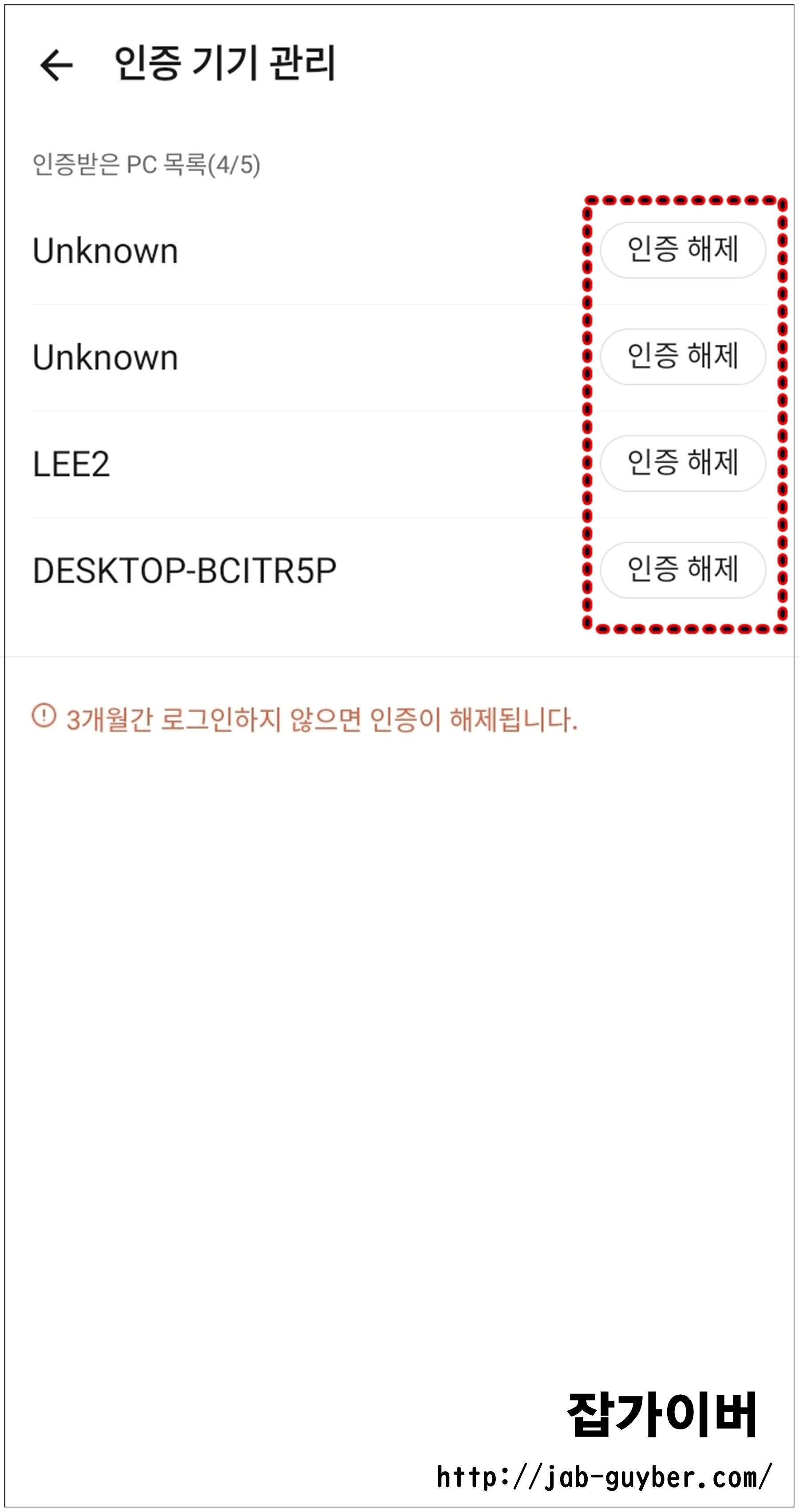 - 필요 없는 기기의 인증을 해제합니다.