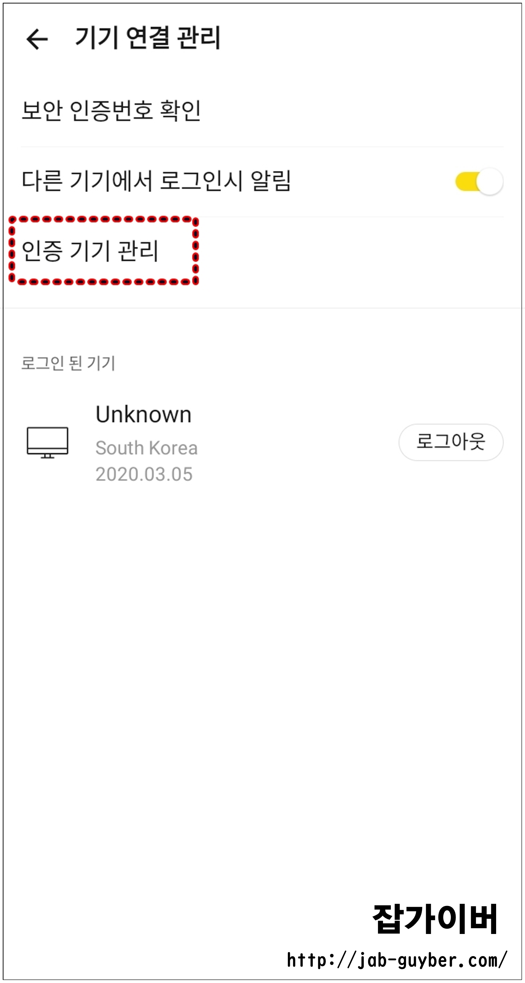 보안 -> 기기 연결관리 -> 인증 기기관리로 들어갑니다.