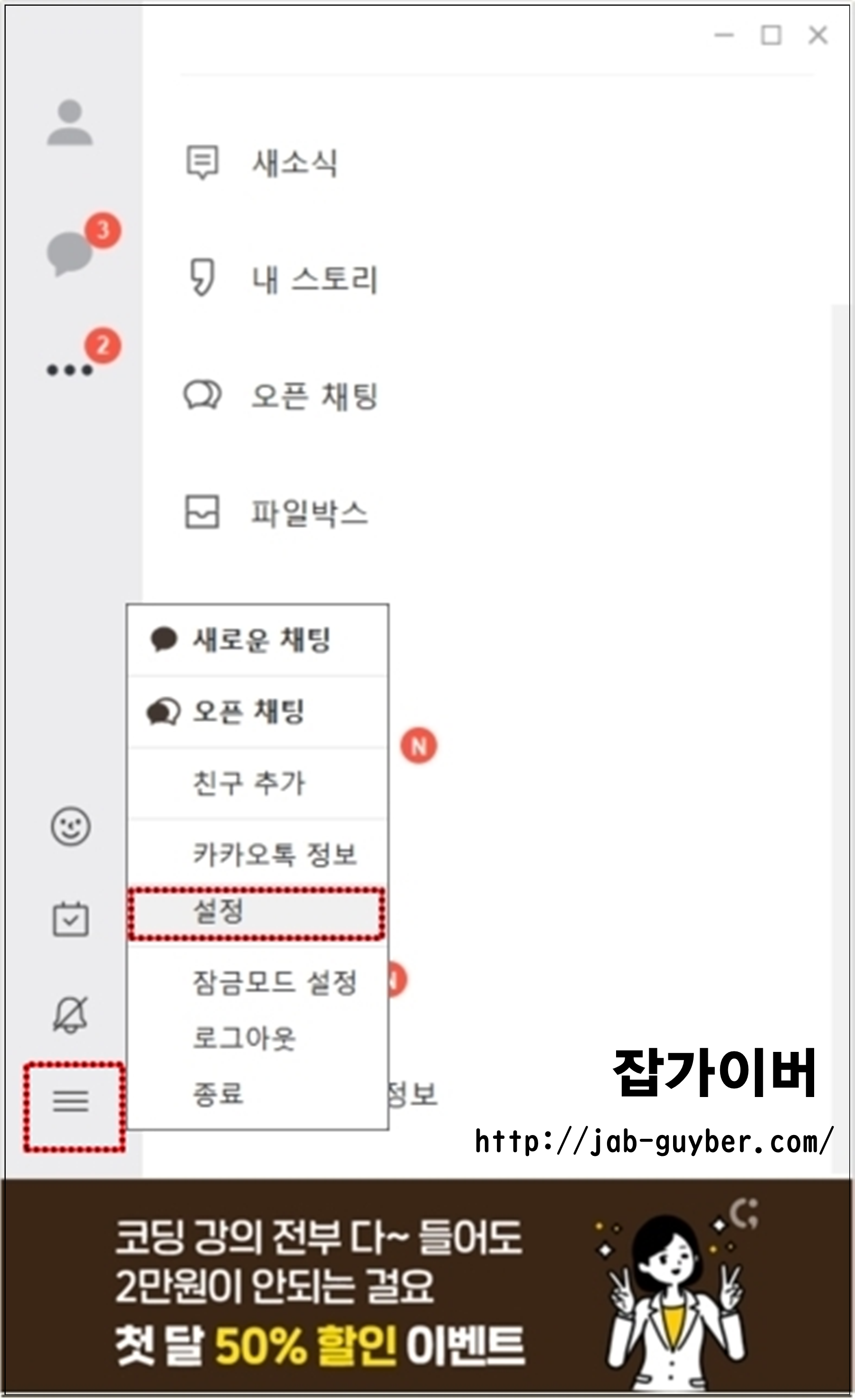 두가지 방법중 편한 방법으로 카카오톡 설정으로 들어갑니다.