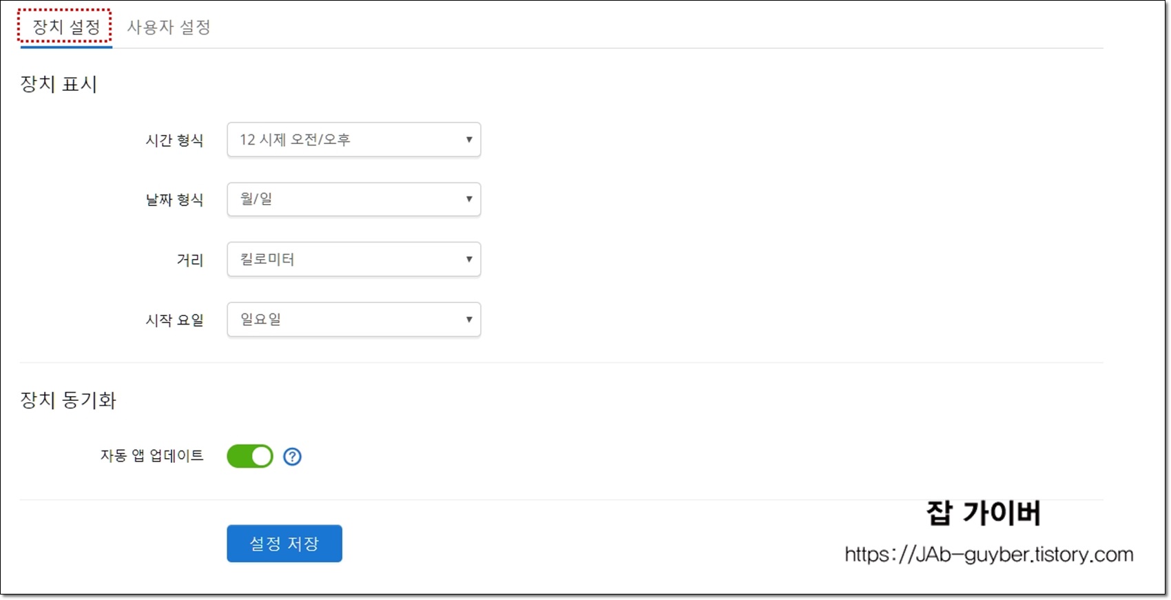 장치설정에서는 가민장치의 시간 및 날짜,거리,시작요일등 기본적인 단위를 선택할 수 있으며 장치동기화를 통해 와이파이나 기기와 연동했다면 "자동 앱 업데이트"가 가능합니다.