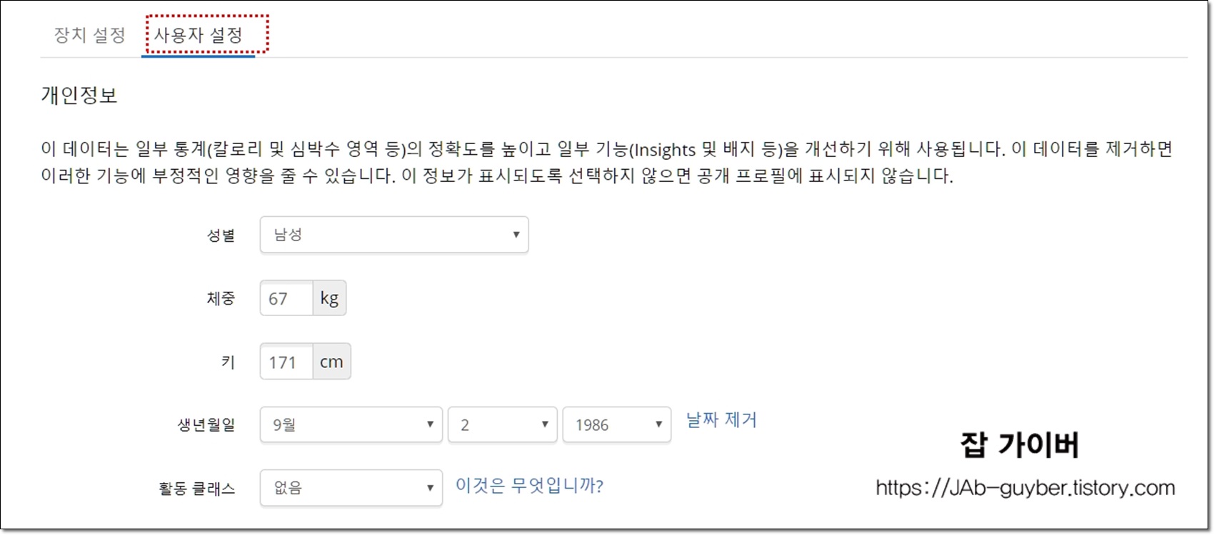 사용자 설정으로 들어가면 개인정보,몸무게 및 키,성별등을 등록합니다.