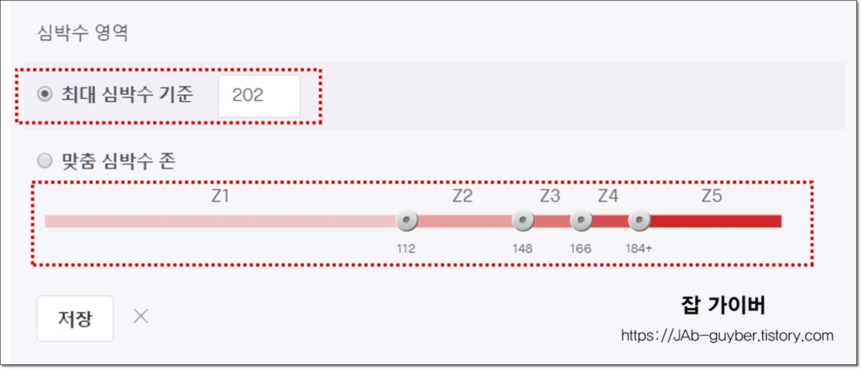 - 맞춤 심박수 존을 이용해 Z1~Z5까지 원하는 심박수 영역을 입력하는 방식