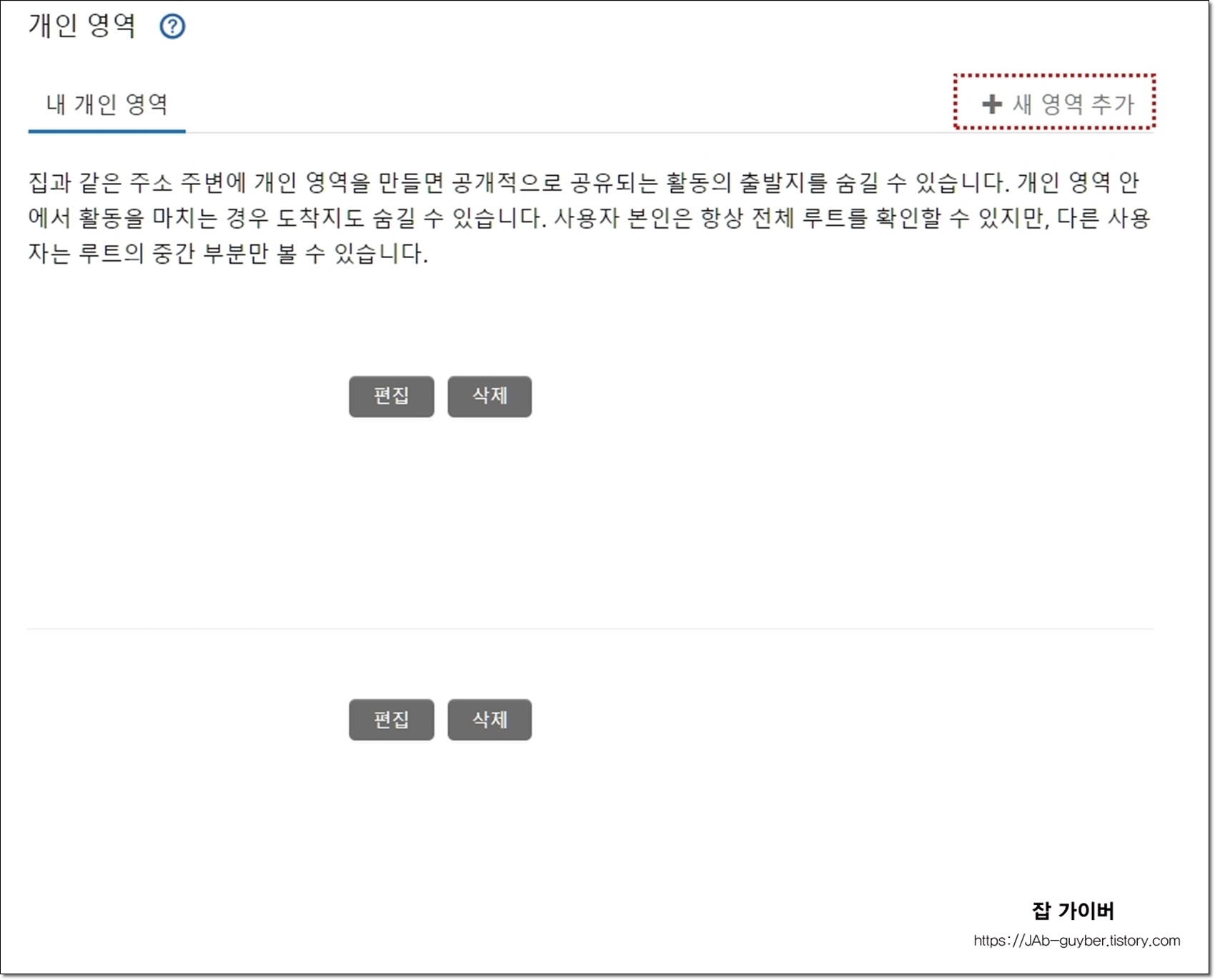 내 개인영역에서는 집과 같은 주소 주변에 개인영역을 만들면 활동의 출발지를 숨길 수 있습니다.