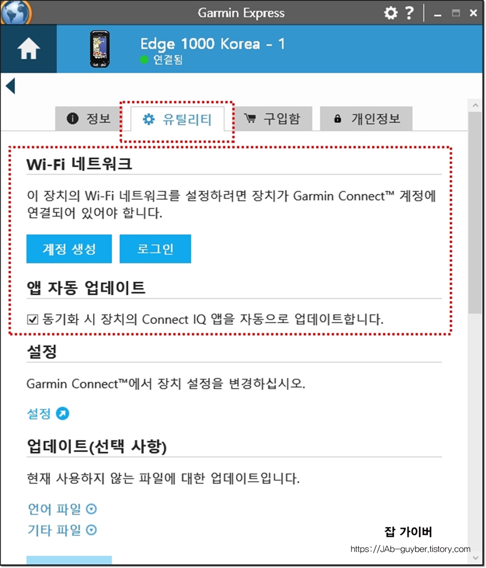 그리고 "유틸리티"탭으로 이동하면 가민계정에 다시 로그인 합니다.