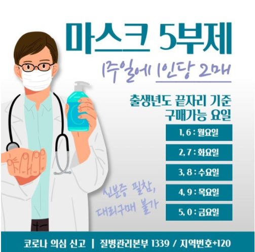 마스크 요일제 즉 5부제라고 볼리는 이 정책은 지정된 날에만 마스크를 구입할 수 있도록 한 것으로, 출생연도 끝자리를 기준으로 합니다.
