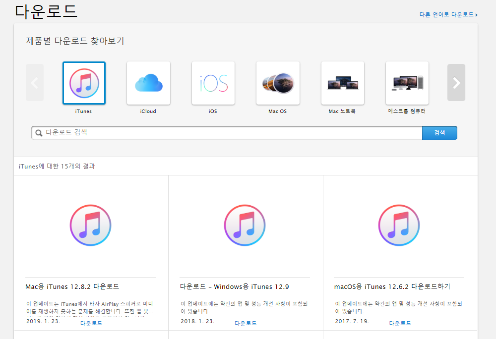 위 사이트를 통해 Mac용 iTunes를 버전별로 다운로드 할 수 있습니다.