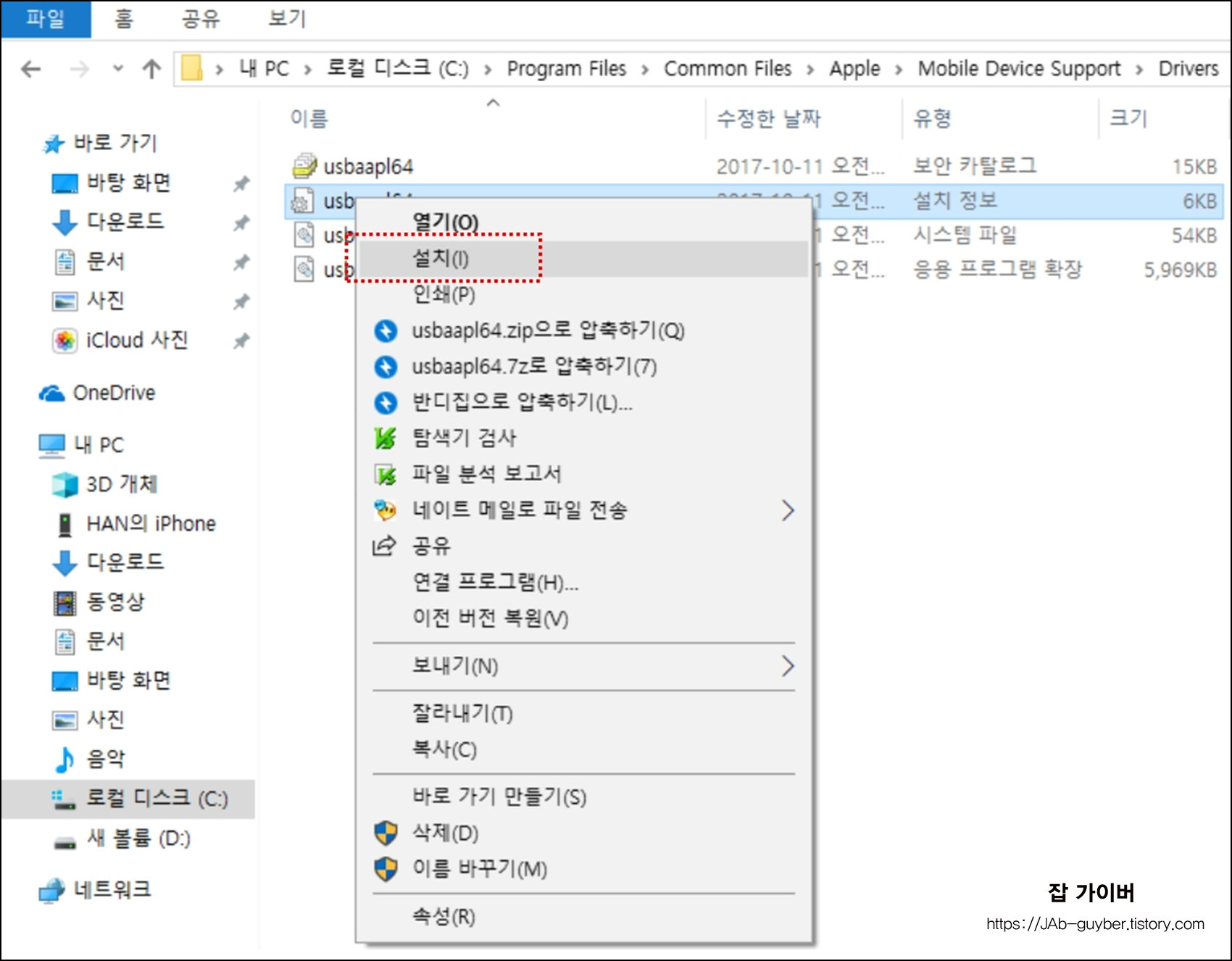 파일을 마우스 오른쪽 버튼으로 클릭해서 “설치”를 선택하면 윈도우에서 해당 드라이버를 다시 등록하게 됩니다. 이후 PC를 한 번 재부팅하고 아이폰·아이패드를 다시 연결해 보면, 그동안 인식되지 않던 기기가 정상적으로 잡히는 경우가 많습니다.