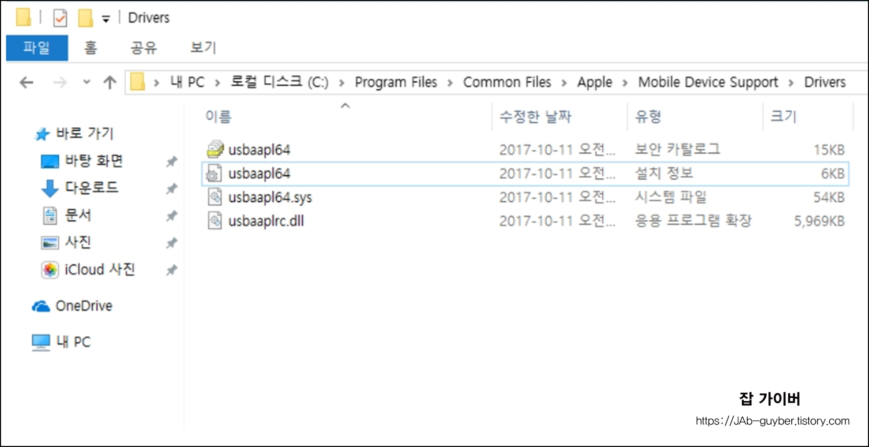 이 폴더로 들어가 보면 usbaapl64 또는 usbaapl 같은 이름의 파일이 보입니다. 이게 아이폰·아이패드를 인식하게 해 주는 핵심 USB 드라이버입니다.