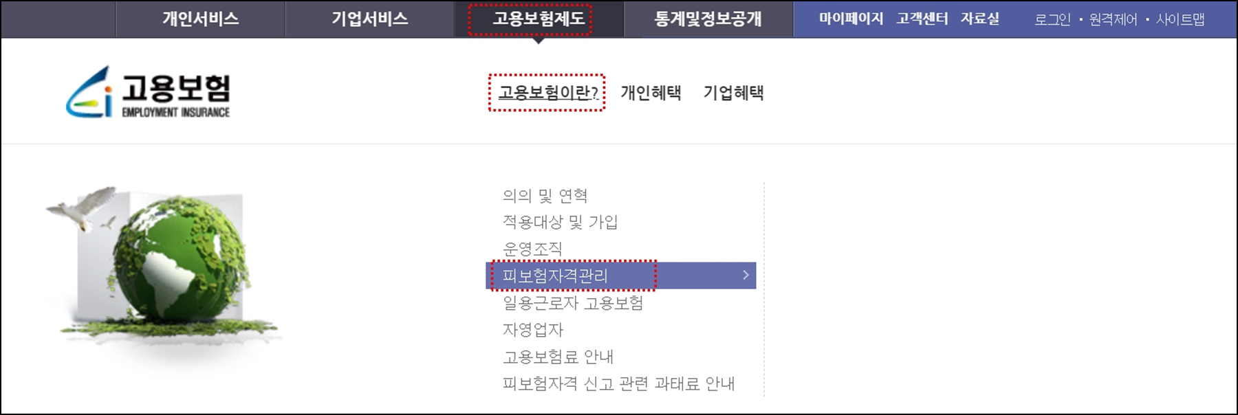 상단의 고용보험제도 -> 고용보험이란? -> 피보험자격관리를 선택합니다.