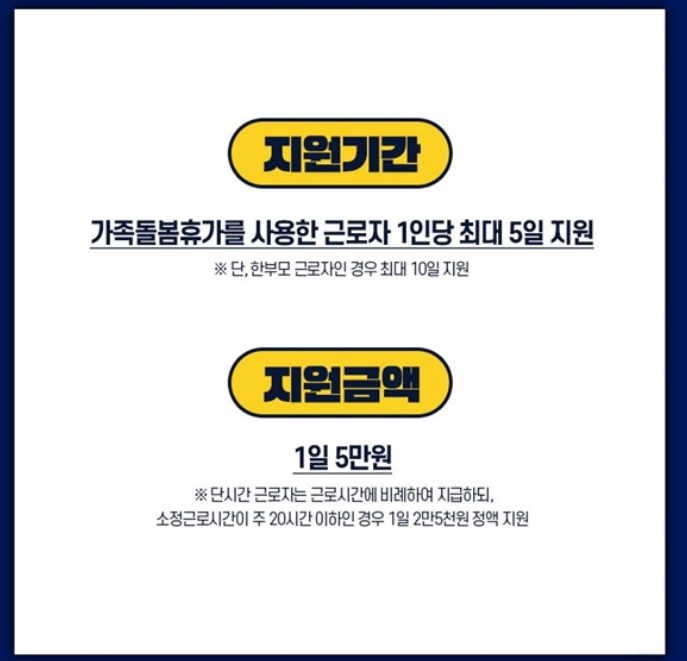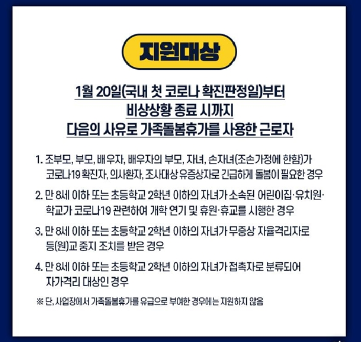 코로나19 확진자 및 의사환자 돌봄, 또는 어린이집, 유치원, 학교의 휴업 및 개학연기 등으로 자녀의 긴급한 가정돌봄이 필요하여 가족돌봄휴가를 사용한 근로자를 대상으로 1인당 일 5만원(부부합산 최대 50만원)을 5일 이내 기간 동안 지원하게 될 예정입니다.