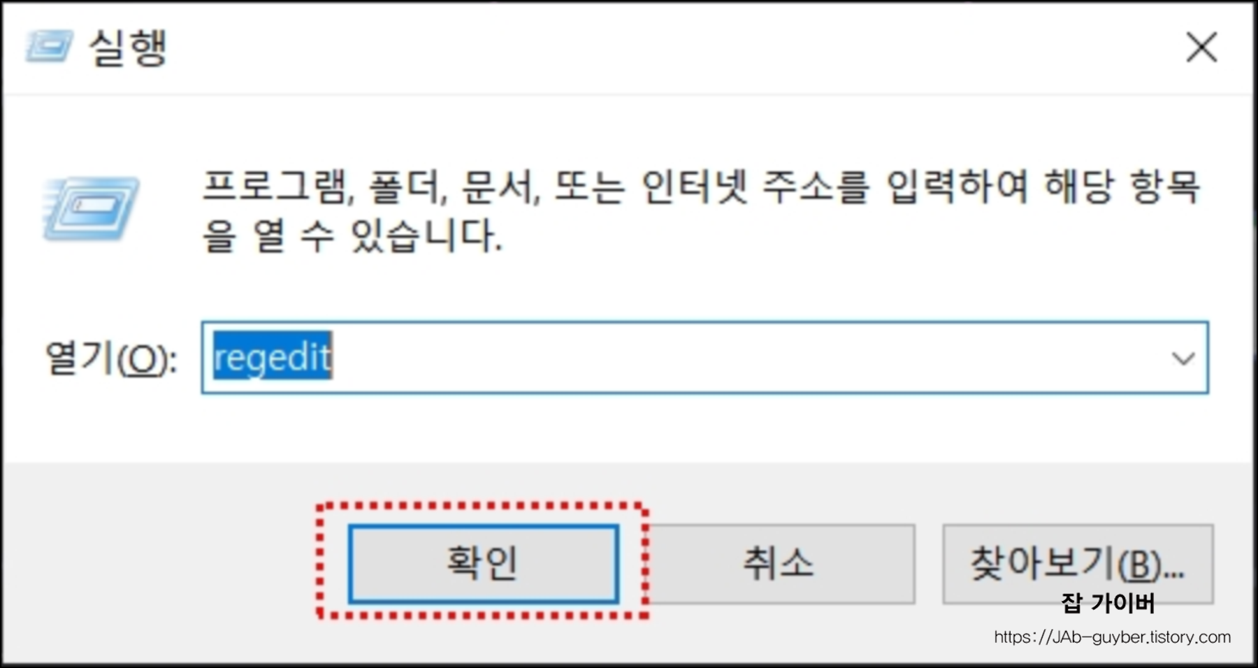 - regedit 검색 후 확인을 눌러 레지스트리 편집기를 실행합니다.