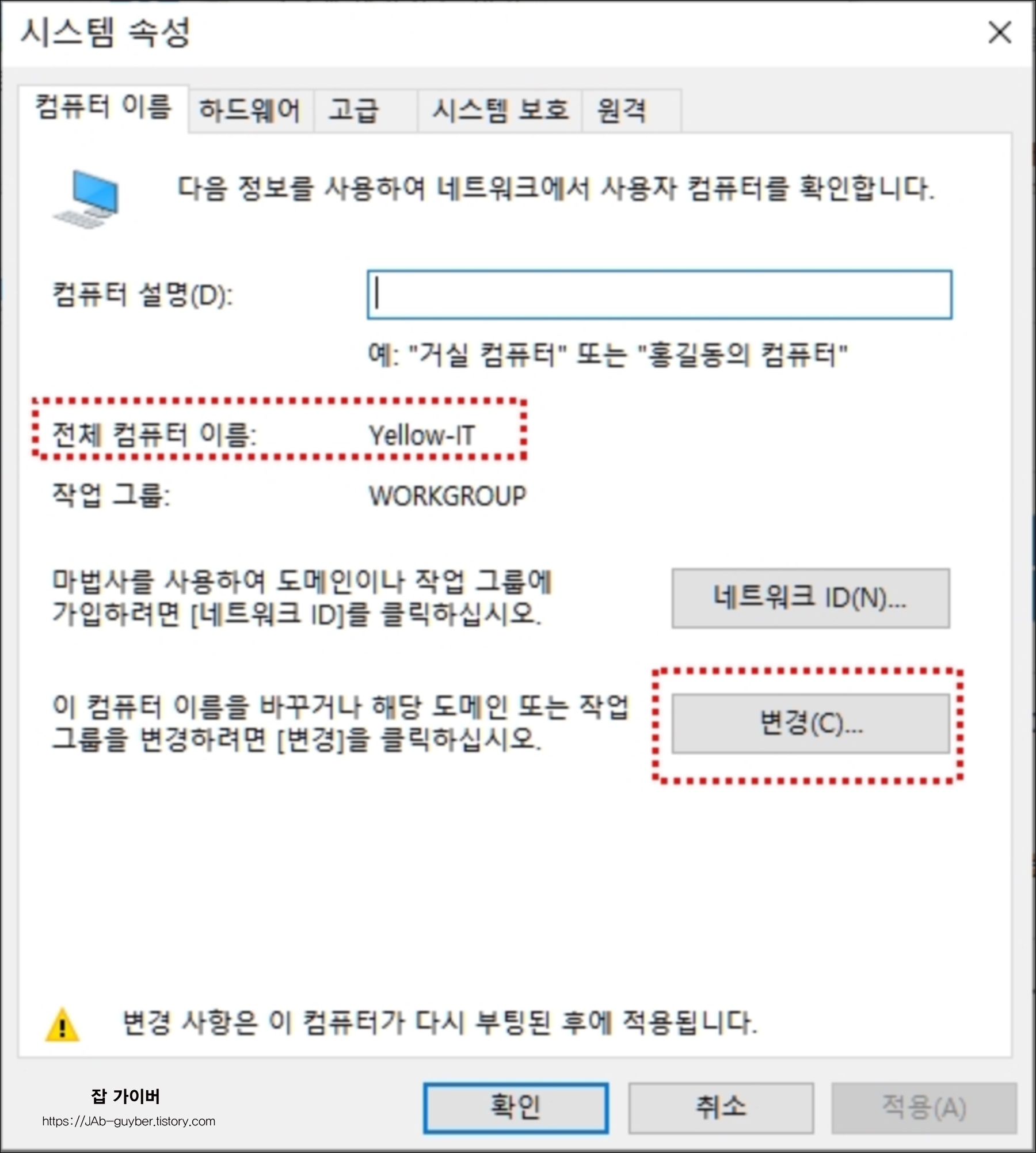 그럼 현재 컴퓨터 이름이 변경된것을 알 수 있으며 저는 아직 컴퓨터를 재부팅하지 않았습니다.