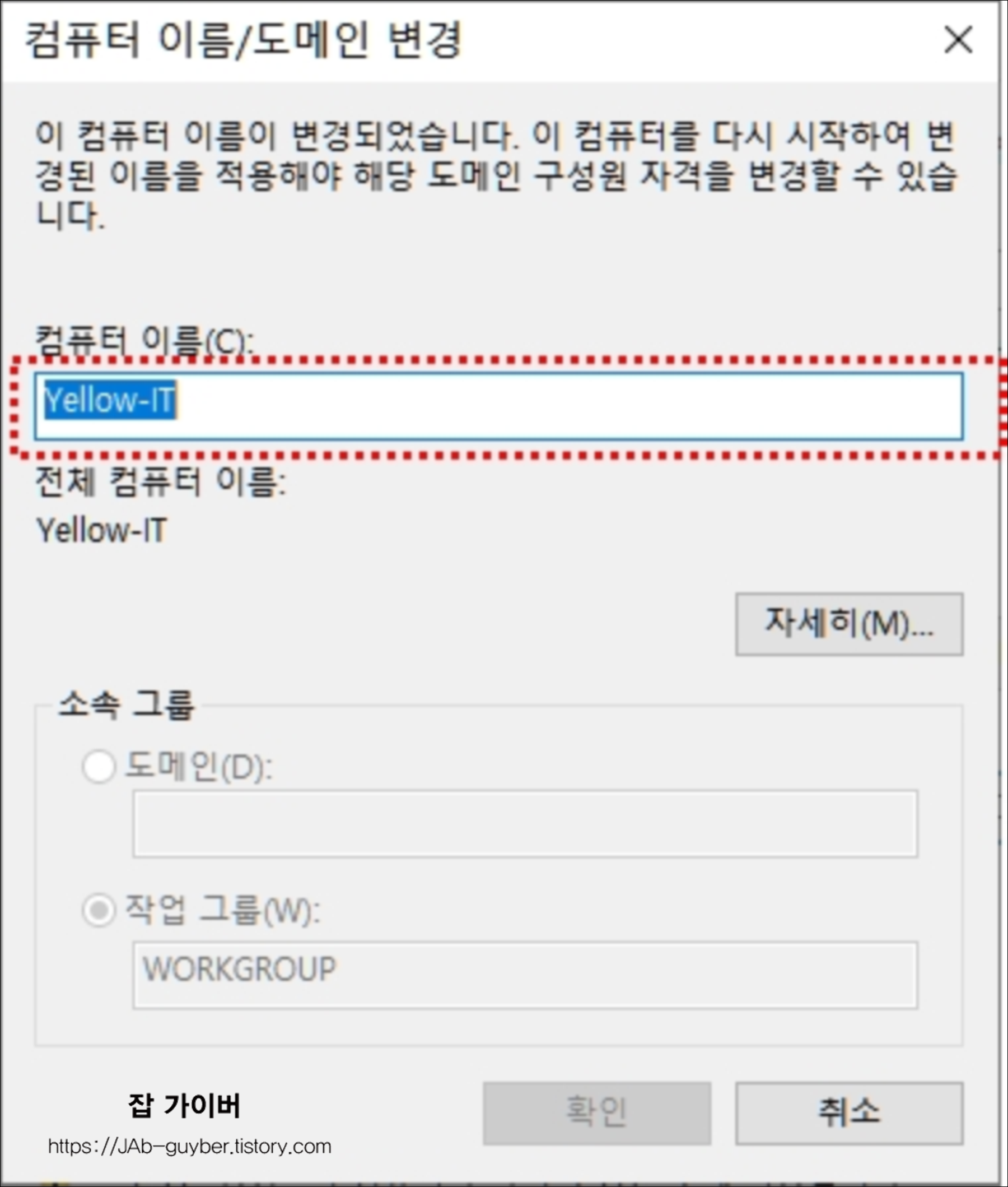 변경할 컴퓨터 이름을 입력하고 확인을 누르면, 설정을 적용하기 위해 재부팅 안내가 뜹니다.