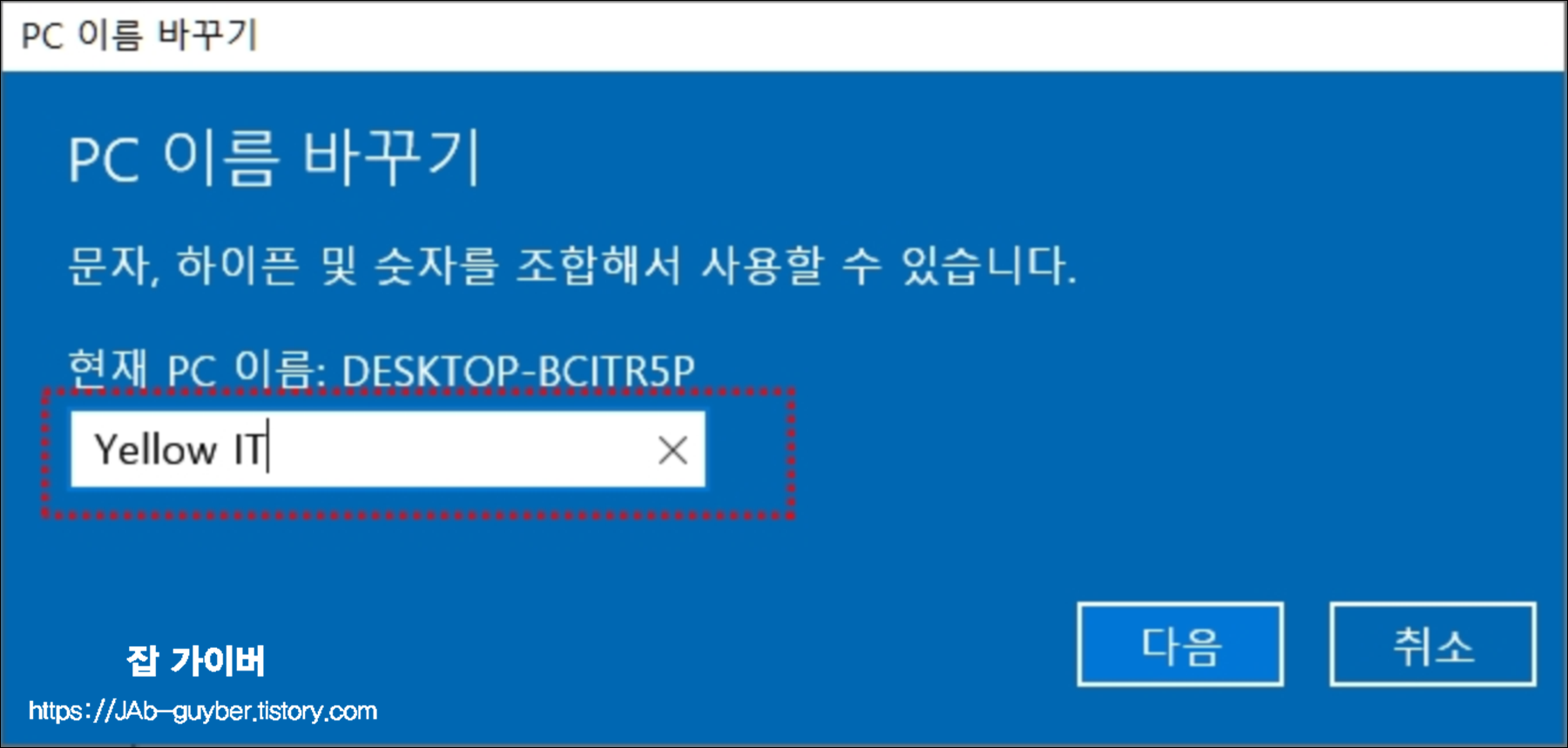 이 창에서는 현재 설정된 PC 이름이 표시되고, 아래 흰 칸에 새로 사용하고 싶은 이름을 입력할 수 있습니다. 이때, 영문 대소문자와 숫자, 하이픈(-) 정도만 사용하는 것이 안전합니다.