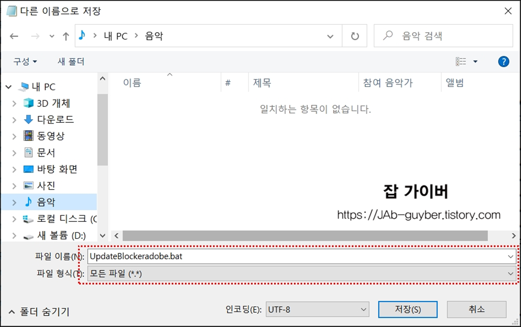 파일 -> 다른이름으로 저장을 통해 "UpdateBlockeradobe.bat"파일 이름으로 선택 파일형식은 "모든 파일"로 변경하고 저장합니다.