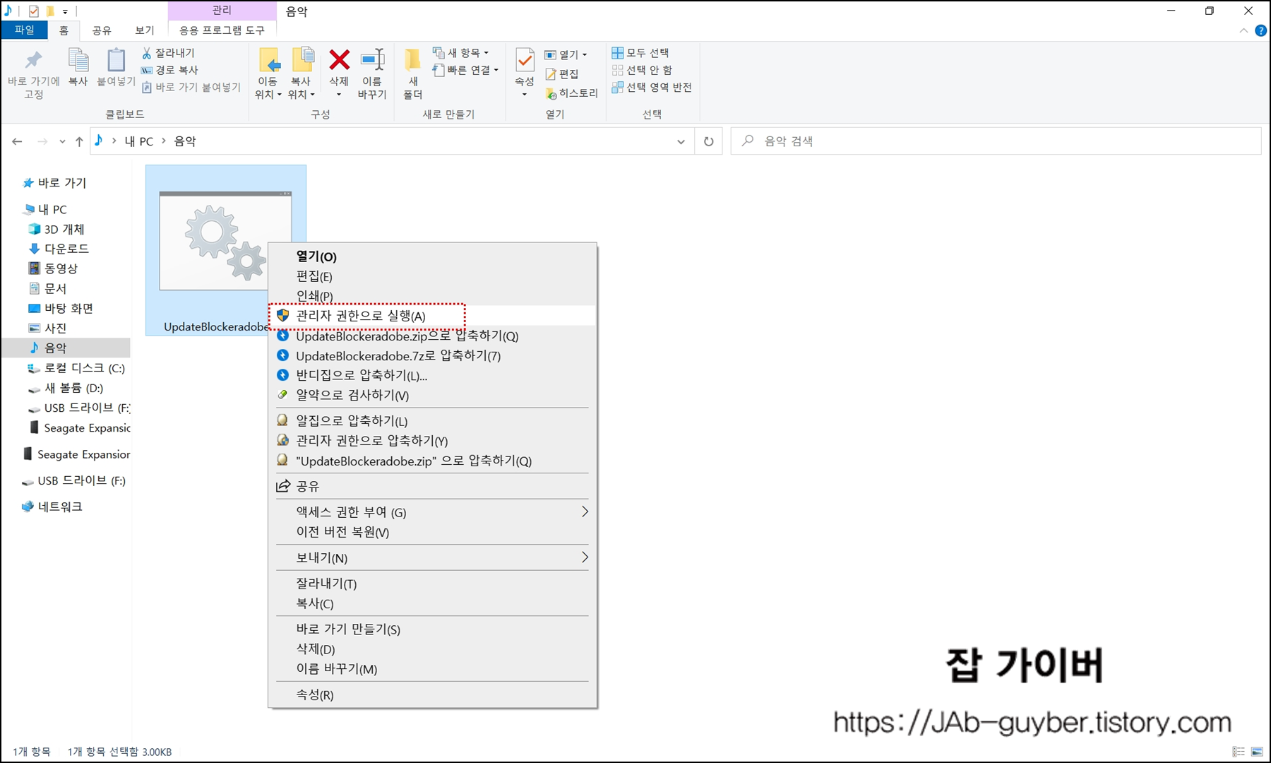저장된 배치파일을 마우스 우클릭 "관리자권한으로 실행"으로 실행합니다.