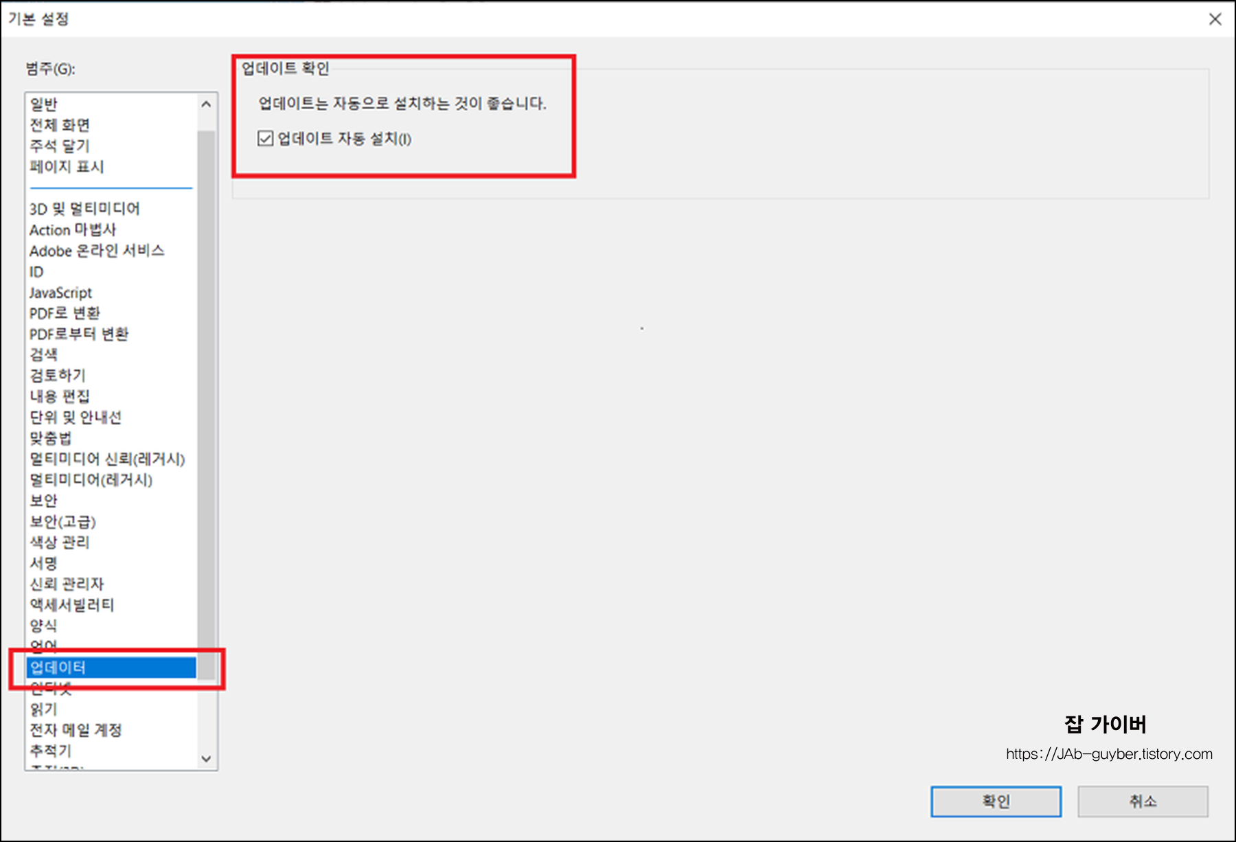 아크로뱃 자동 업데이트 설정 및 끄기 옵션