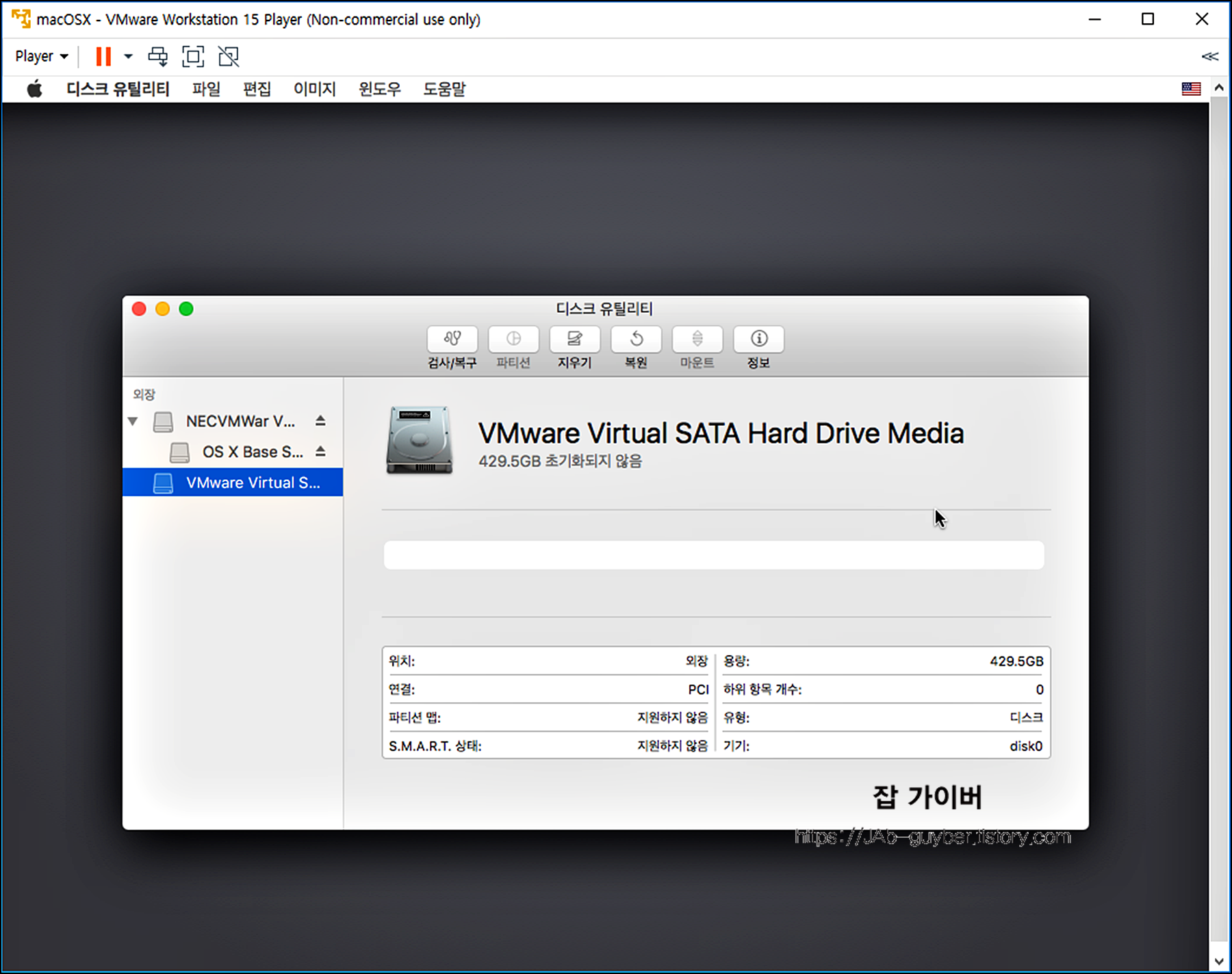 유틸리티 메뉴에서 디스크 유틸리티 선택 후 VMWare Virtual Sata Hard Drive Media를 선택합니다.