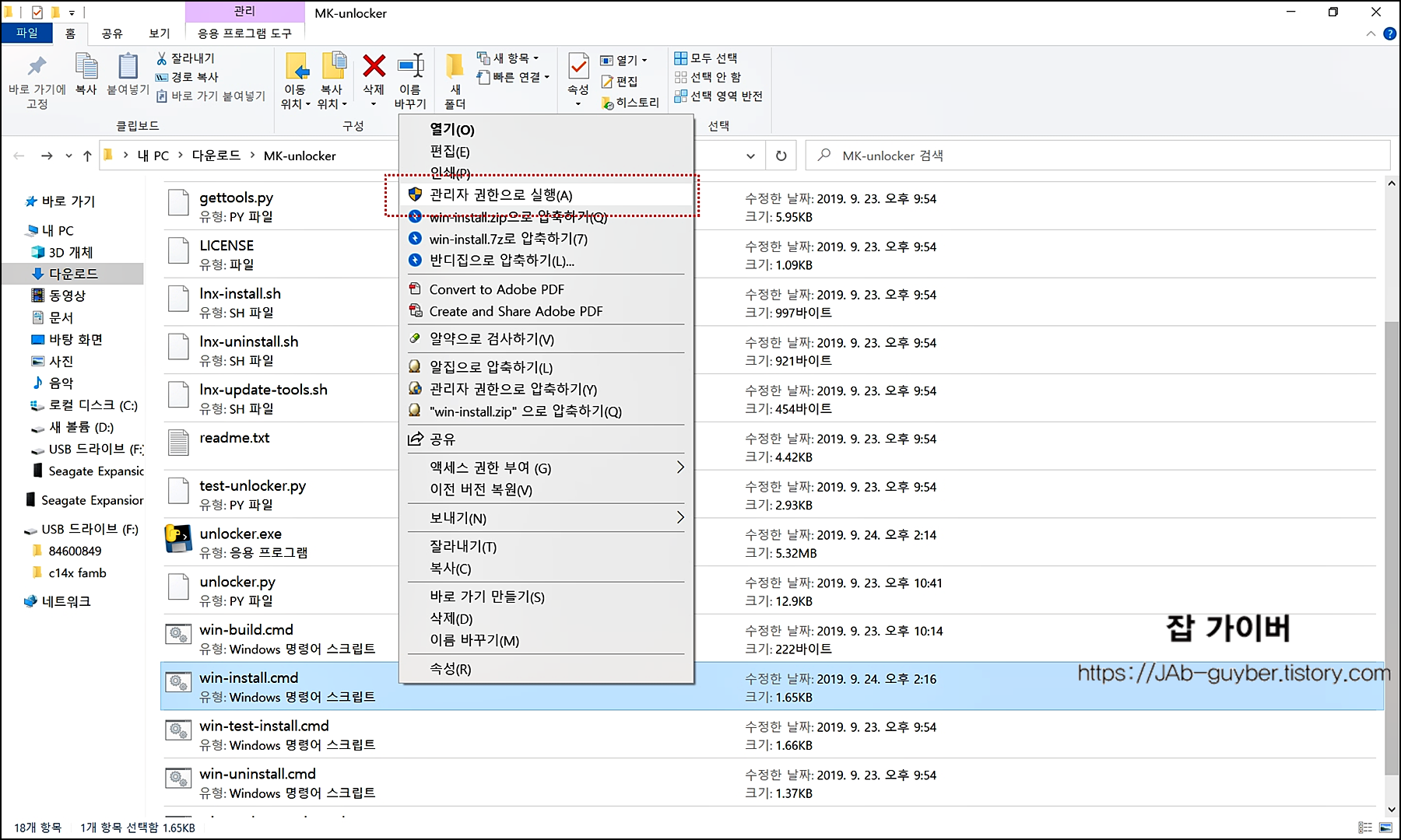반디집으로 분할압축했으며 압축을 해제 후 "win-install"파일을 "관리자권한으로 실행"으로 설치합니다.